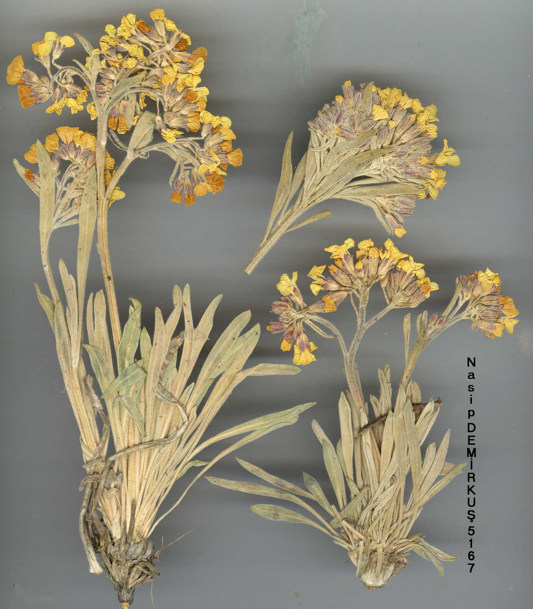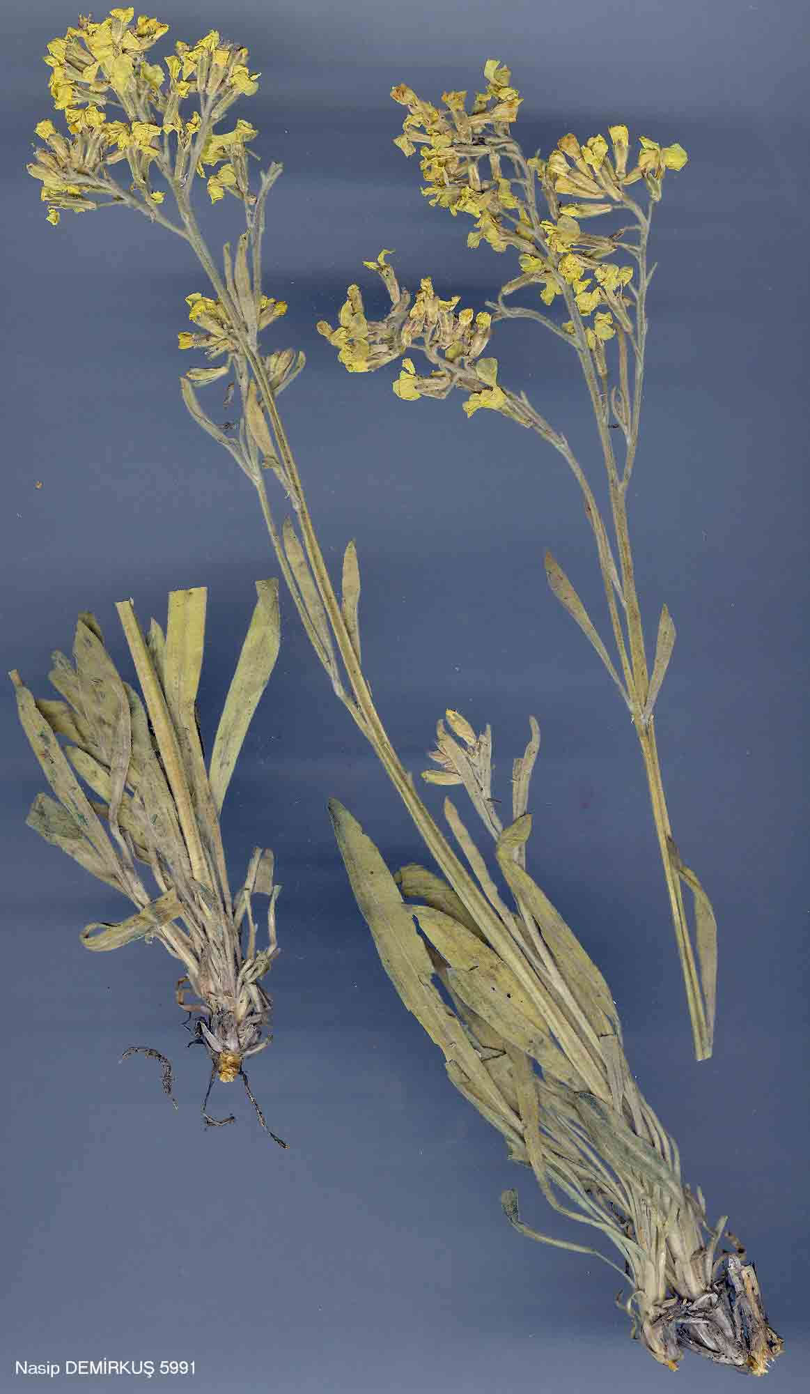 | A. elichrysifolium (DC.) Boiss., Fl. Or. 1: 240 (1867). Syn: Sterigma elichrysi-folium DC, Syst. 2: 581 (1821). Perennial herb with a short woody stock and numerous sterile rosettes. Stems erect, sometimes scapose, 4-40 cm. Leaves entire, usually canescent, oblanceolate to spathulate, tapering into a long petiole. Flowers very fragrant. Petals bright yellow, (6-)10-13 mm. Siliquae usually lanceolate, often constricted between the seeds, pubescent, 10-30 mm, borne on erect-spreading, or rarely deflexed pedicels. Stigma lobes diverging. A very polymorphic species, divisible in Turkey into 6 subspecies: 1. Petals 6-9 mm; siliquae villous with hair as long as the siliqua is broad subsp. villosum 1. Petals usually 10-13 mm; siliquae less densely pubescent 2. Whole plant densely white-pannose subsp. canescens 2. At most the young leaves white-pannose 3. Stems unbranched, usually scapose subsp. elichrysifolium 3. Stems branched above, usually leafy 4. Plants completely egiandular subsp. persicum 4. Plants with glands on the stems and pedicels 5. Plants canescent as well as glandular subsp. cilicicum 5. Plants principally glandular, with a few branched hairs, but not canescent subsp. glandulosum subsp. glandulosum Cullen & Coode in Notes R.B.G. Edinb. 26: 193 (1965). Fl. 7-8. Rocky places, 2500-3300 m. Type: Turkey B7 Erzincan: foot of Keşiş Dağ, above Cimin, 2500 m, Davis & Hedge D. 31693 (holo. E!). Upper Euphrates, Kurdistan. B7 Erzincan: Keşiş Da., above Cimin, 2600 m, D. 31757! C9 Hakkari: Cilotepe, 3300 m, D. 24062! Endemic; Ir.-Tur. element. |