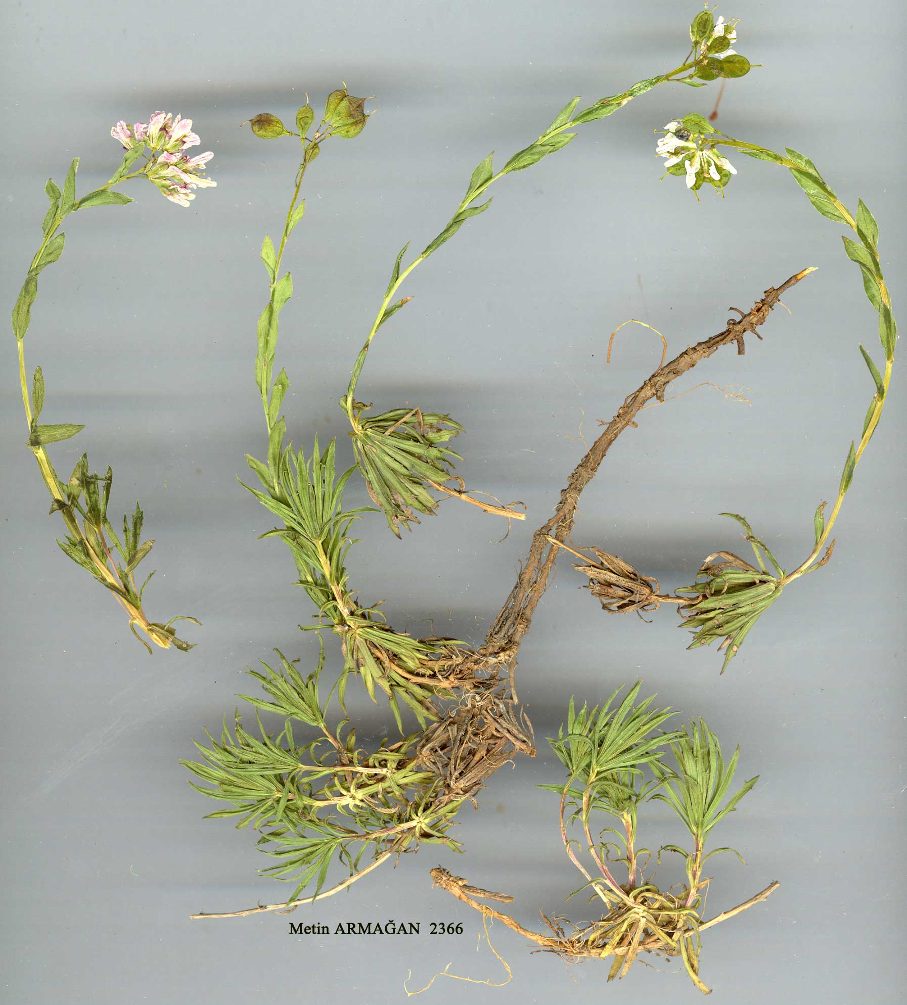 | C. vesicaria (L.) Holmboe in Berg. Mus. Aarb., n. 13, 6 (1907). Syn: Alyssum vesicaria L., Sp. Pl. 910 (1753); Coluteocarpus reticularus Boiss. in Ann. Sci. Nat. 17: 162 (1842). Ic: Schulz, Pflanzenfam.. ed. 2, 17b: fig. 252 (1936). Figure 10, p. 251. Clump-forming perennial herb, stems 4-18 cm. Basal leaves linear, oblong-lanceoiate or ± spathulate. alternate at base, with 3-5 small teeth on each side. Stem leaves sessile, oblong-lanceolate, entire. Inflorescence elongating in fruit. Petals 6-11 x 2.5-4 mm spathulate, rounded or subacute at apex, limb gradually narrowed into claw. Fruiting pedicels thin, reflexed, 4-9 mm. Fruit 14-33 x 16-21 mm; septum complete or marginal only, 15-33 x 8-18 mm; style persistent 1-4 ram; seeds 2-10, not mucilaginous. 1. Leaves of basal rosettes rhomboid to ovate to spathulate; septum complete; seeds (l-)2 subsp. boissieri 1. Leaves of basal rosettes linear or oblong-lanceolate; septum marginal; seeds 4-10(-12) subsp. vesicaria subsp, vesicaria, Ic.: Schulz, Pflanzenfam., op. cit., f. 252. Fl. 4-6. Stony slopes and screes, 1200-27G0 m. Described from material of Tournefort and probably of Armenian origin. Armenia, Upper Euphrates. Kurdistan. A7 Gümüşane: Gümüşane to Bayburt, 1500 m, Stainton 8344! A8 Erzurum: d. Ispir, 41 km S of Ispir, 2200 m, Hub.-Mor. 16238. A9 Çoruh: d. Ardanuç, Kordevan Da., 2700 m, D. 30357! B7 Erzincan: Keşiş Da., above Cimin. 2500-2600 m, D. 31672! Tunceli: Pülümür to Mutu, 1760 m, Hub.-Mor. 10977; Munzur Da., above Ovacik, 2400 m, D. 31208A! Elaziğ: Kharput (Harput), Sint. 1889:333! B8 Erzurum: Erzurum, Calvert. B9 Bitlis: Shemaran (c. 10 miles S of Van), Post 1906: 666! Transcaucasia. Ir.-Tur. element. Common in the Gümüşane region. Fairly constant in characters except where its range overlaps that of the other subspecies. subsp. boissieri (O. E. Schulz) Hedge in Notes R.B.G. Edinb., 26: 181 (1965). C. boissieri O. E. Schulz in Pflanzenfam., ed. 2, 176: 428 (1936). Fl. 4-6. Stony slopes and screes, 2200-3300 m. Described from Kurdistan. Kurdistan. B9 Bitlis: Kambos Da. above Hurmuz, 2450 m, D. HAITI Nemrut Da., 2200 m, Birand &. Karamanoğlu 220. C9 Hakkari: Cilo Da., 10 km W of Cilo Tepe, 3650 m, D. 24204! Lebanon, N. Iraq, W. Iran. Ir.-Tur. element. A fairly constant taxon through-out its range. The following Turkish specimen is somewhat intermediate between subsp. boissieri and subsp. vesicaria: B9 Van: d. Başkale, Ispiriz Da., 3300 m, D. 23699! |