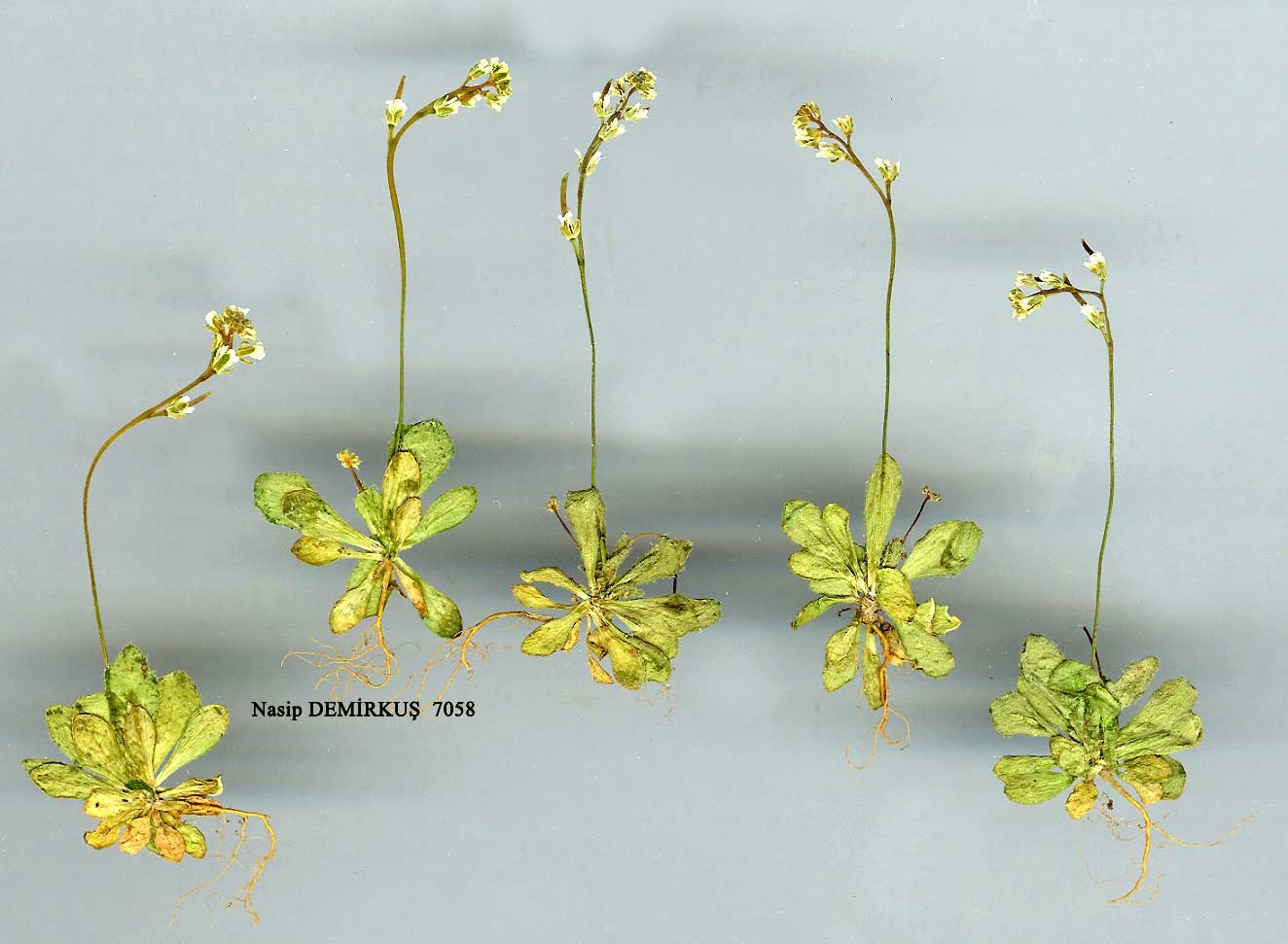| D. verna C. Koch in Linnaea 15: 253 (1841). Syn: Arabis nuda Belanger ex Boiss. in Ann. Sci. Nat. 17: 54 (1842); Sisymbrium nudum (Bel. ex Boiss.) Boiss., Fl. Or. 1: 214(1867); Drabopsis nuda (Bel. ex Boiss.) Stapf in Denk. Akad. Wiss. Wien, Math.-Nat. Kl. 51(2): 30 (1886); Arabidopsis verna (Koch) Busch in Fl. Cauc. Crit. 3(4): 460 (1909). Figure 13, p. 257. Scapose annual herb. Stems erect, up to 10 cm. Leaves oblong-spathulate, entire or weakly dentate, with an indumentum of stellate-furcate hairs. Petals yellowish, c. 3-4 mm. Siliquae strict, flattened, borne on somewhat thickened pedicels. Style very short. Fl. 5. Type: in arenosis Armeniae, C. Koch. Mainly East Anatolia. A7 Gümüşane: Chakaxa, 1894 Sint.! B7 Erzincan: Egin (Kemaliye), Hodschadur Dagh, Sint. 1890: 2286! B8 Erzurum: Erzurum, vi 1853, Huei! B9 Muş: Malazgirt, 1500 m, Schischkin. BIO Ağri: Bayazid (Doğu-bayazid), Aucher 4115! C5 Niğde: Maaden, 2000 m, Siehe 1898: 6! C8 Mardin: Terek (Derik), Hausskn.! Soviet Armenia, N. Iran, Afghanistan, W. Himalayas. Ir.-Tur. element. |