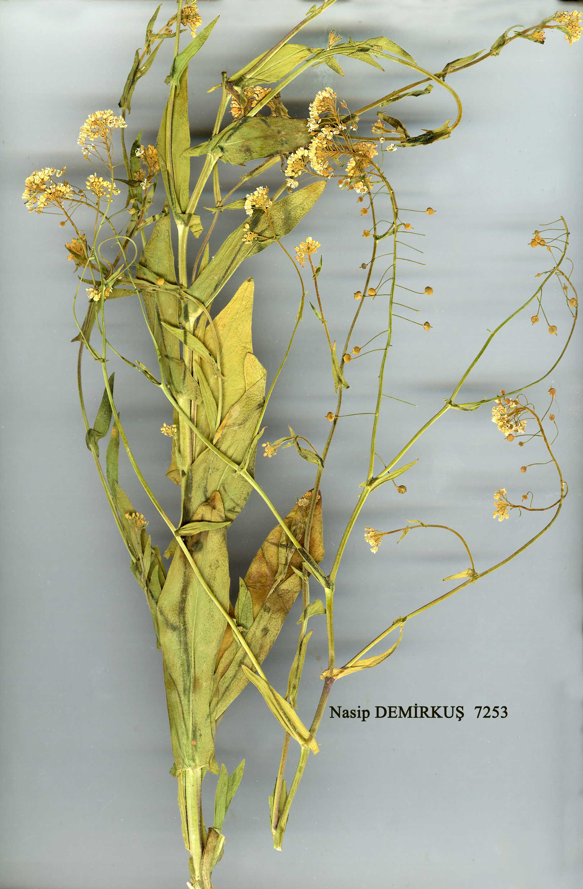 | N. paniculata (L.) Desv. in J. Bot. Appl. 3: 162 (1814). Syn: Myagrum pani-culatum L., Sp. PI. 641 (1753); Vogelia paniculata Hornem., Hort. Hafn. 2: 594 (1815). Ic.: Vierhapper, op, cit., f. Figure 11, p. 253. Annual, 15-60 cm, sub-simple or branching above middle. Leaves oblong or oblong-lanceolate, clasping, sagittate, acute at apex, margins entire or toothed. Petals c. 2 mm. Fruiting pedicels 6-12 mm. Fruit 2-2.5 x 2.5-3 mm, without an umbo after the style has fallen. Fl. 4-7. Fields, roadsides, rocky slopes. Described from Europe (Hb.'Linn. 819/10 photo.!). Armenia. A8 Çoruh: nr. Artvin (Grossheim 4: map 274). A9 Kars: Selim to Sarikamiş, 1900 m, D. 30685! Europe, N. Africa, S. Russia, Caucasus, Tien Shan. |