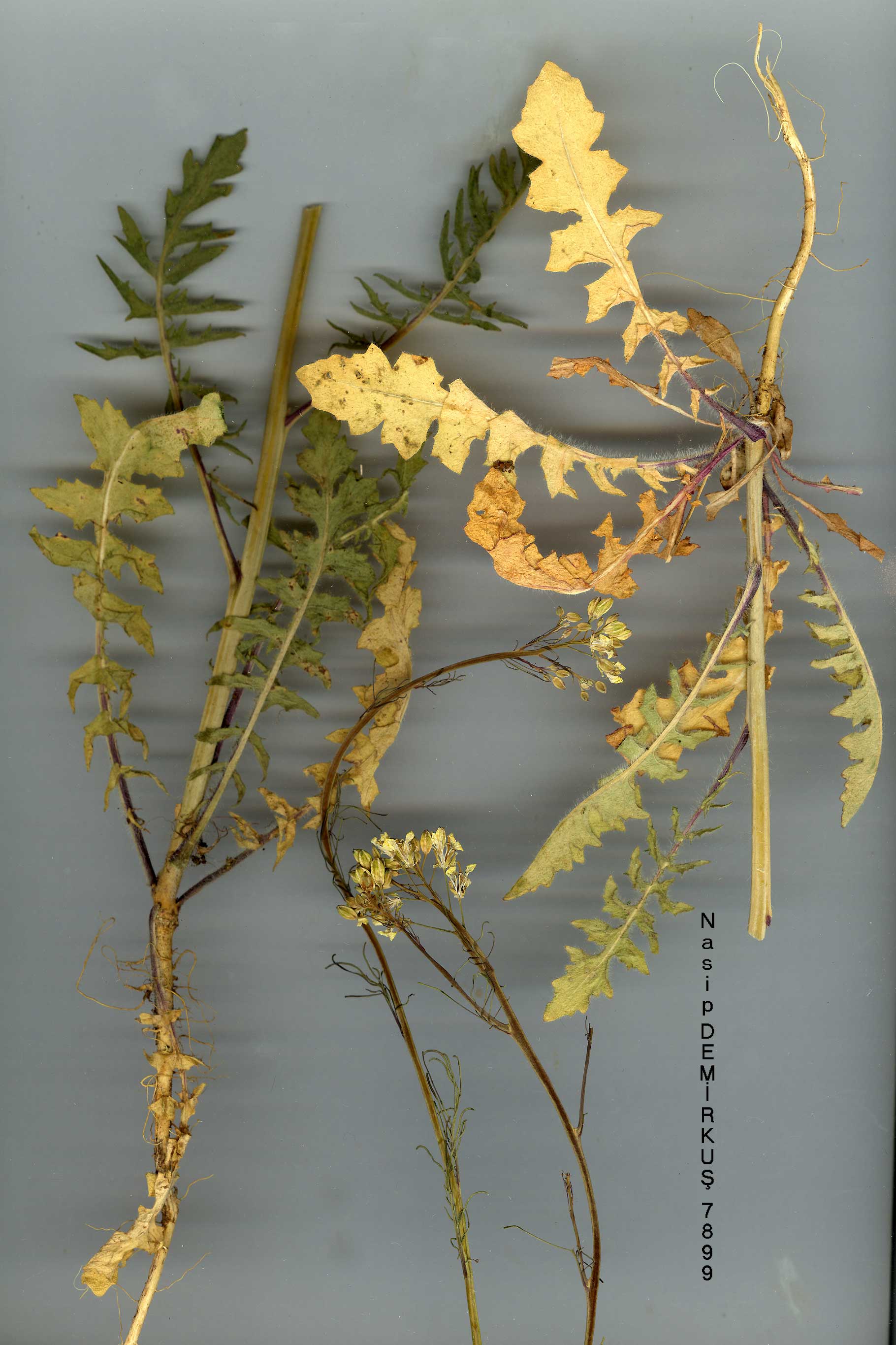 | S. altissimum L., Sp. PL 659 (1753). Syn: 5. pannonicum Jacq., Ic. PL Rar. 1: 12, t. 123 (1781-86). Ic: Ross-Craig, Draw. Brit. PL 3: 39 (1949). Figure 12, p. 255. Annual or biennial, 20-100 cm, with an indumentum of long stiff white hairs at base of stem and on leaves. ± glabrous above. Basal leaves not rosette-forming, runcinate-pinnatifid with 6-8 pairs of lateral lobes. Petals yellow, (6-)9-12 x 4-4.5 mm. Fruiting pedicels 5-12 mm, obliquely erect. Siliquae (2.5-)8-l 1 cm x c. 1 mm, straight, held at same angle as the pedicels; valves glabrous, thick-walled, obscurely nerved, style 1-2 mm. Radicle incumbent or obliquely so. Fl. 3-6. Cultivated land and waste places, s.1.-1400 m. Described from Italy, France and Siberia (Hb. Linn. 836/32 photo!). Widespread except in the east. A1(A) Çanakkale: Bunarbahçe, Sint. 1894: 1017. A2(A) Istanbul: Fenerbahçe, 4 v 1916, Azn.! A5 Amasya: Çekerek valley, Çetik! A8 Gümüşane: Bayburt, Sint. 1894: 6137. Bl Izmir: Boz Da., 800 m, Hub.-Mor. 2726. B3 Eskişehir: Eskişehir, Warburg & Endlich 198. B4 Ankara: Ankara, Karamanoğlu. B5 Nevşehir: Mucur to Sifegöl, D. 21803! B6 Maraş: Berit Da. to Elbistan, 1400 m, Stn. & Hend. 5620! C1 Aydin: Aydin, Boiss. C2 Denizli: Muğla to Tavas, 900 m, D. 35552! C4 Konya: Konya to Çumra, Helbaek 2514! C5 Seyhan: 5 km from Pozantı, 870 m, Hub.-Mor. 13754. C. Europe and S.W. Asia. |