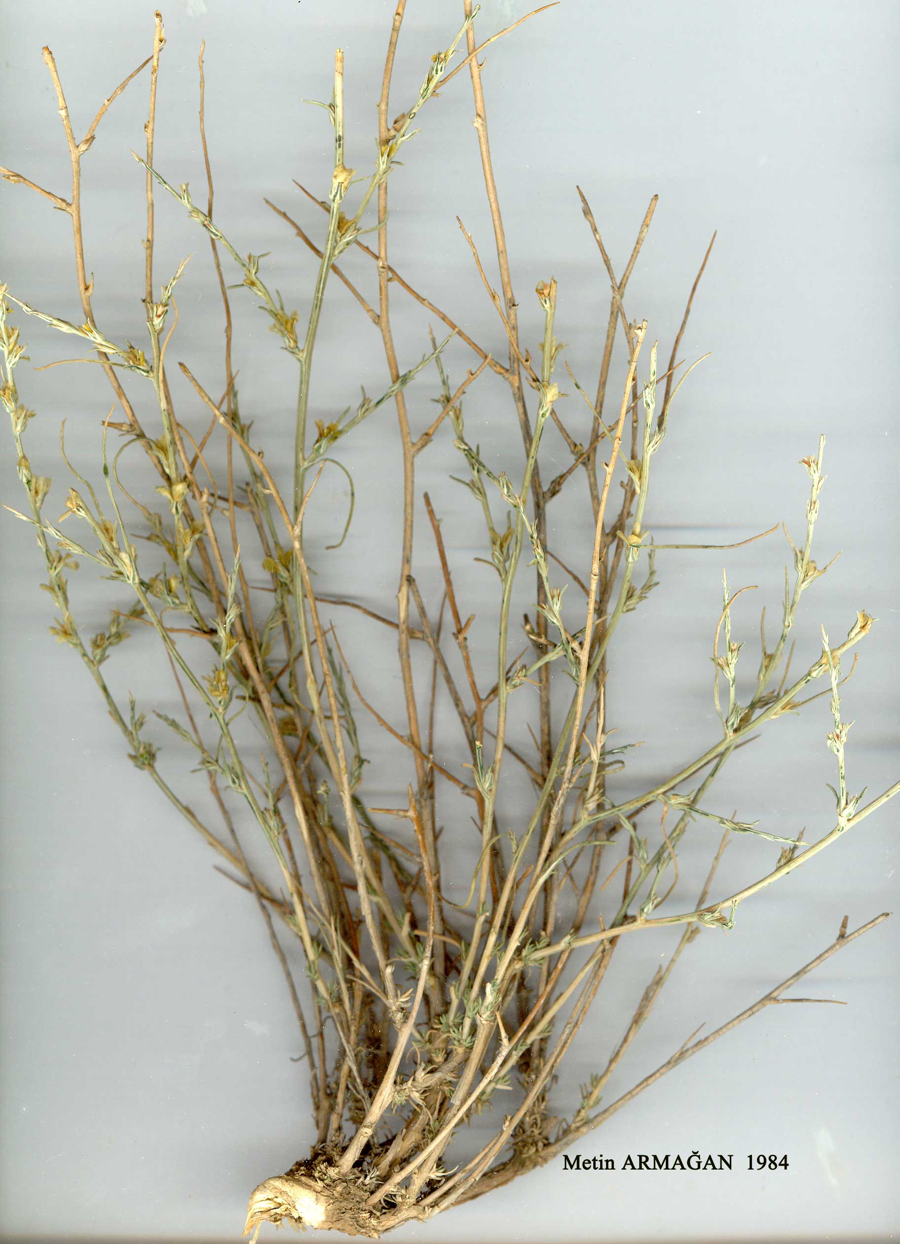 | N. mucronata (Forssk.) Aschers. & Schweinf. in Mem. Inst. Egypt. 2: 131 (1887). Plant branched, branches usually spine-tipped, up to 1 mm, glabrous, papillose or bristly. Leaves 10-25 x 5 mm, with an ovate base, subulate or linear-filiform above. Bracts and bracteoles narrowly ovate, hardening, shorter than or exceeding the flowers. Perianth 3-4 mm, glabrous, the segments winged, wing with an entire or erose margin. Style elongate, thick. 1. Leaves 1-2.5 cm; bracts not or scarcely exceeding the flowers; branches usually numerous, short, spreading subsp. mucronata 1. Leaves 3-4 cm; bracts exceeding the flowers; branches themselves little-branched, elongate subsp. tournefortii subsp. mucronata. Syn: Salsola mucronata Forssk., Fl. Aeg.-Arab. 56 (1775); N. spinosissima Moq. in DC, Prodr. 13(2): 209 (1849). Fl. 5-7. Sandy and stony steppes, 500-2000 m. Described from Egypt: Alexandria, at the catacombs. A2(E) Istanbul: Istanbul, 1941, Başarman! A4 Ankara: Hacikadin De., 14 ix 1944, Kasapligil! A5 Amasya: Amasya, nr. Kirklar, 500 m, Bornm. 1890: 3089! B4 Ankara: Ankara, Başarman1. B5 Nevşehir: Göreme, 1000 m, McNeill 412! B9 Van: Van to Hoşap, 1900 m, McNeill 672! B1O Kars: Iğdir, Boralar Tepe, 850 m, Demiriz 3300! C2 Denizli: Baba Da., 2300 m, D. 18383! C3 Antalya: nr. Çalbali Da., D. 15376! C4 Konya: Ermenek, D. 16143! Niğde: Bulghar Maden, Siehe 1896:603! N. Africa, Caucasia to C. Asia. |