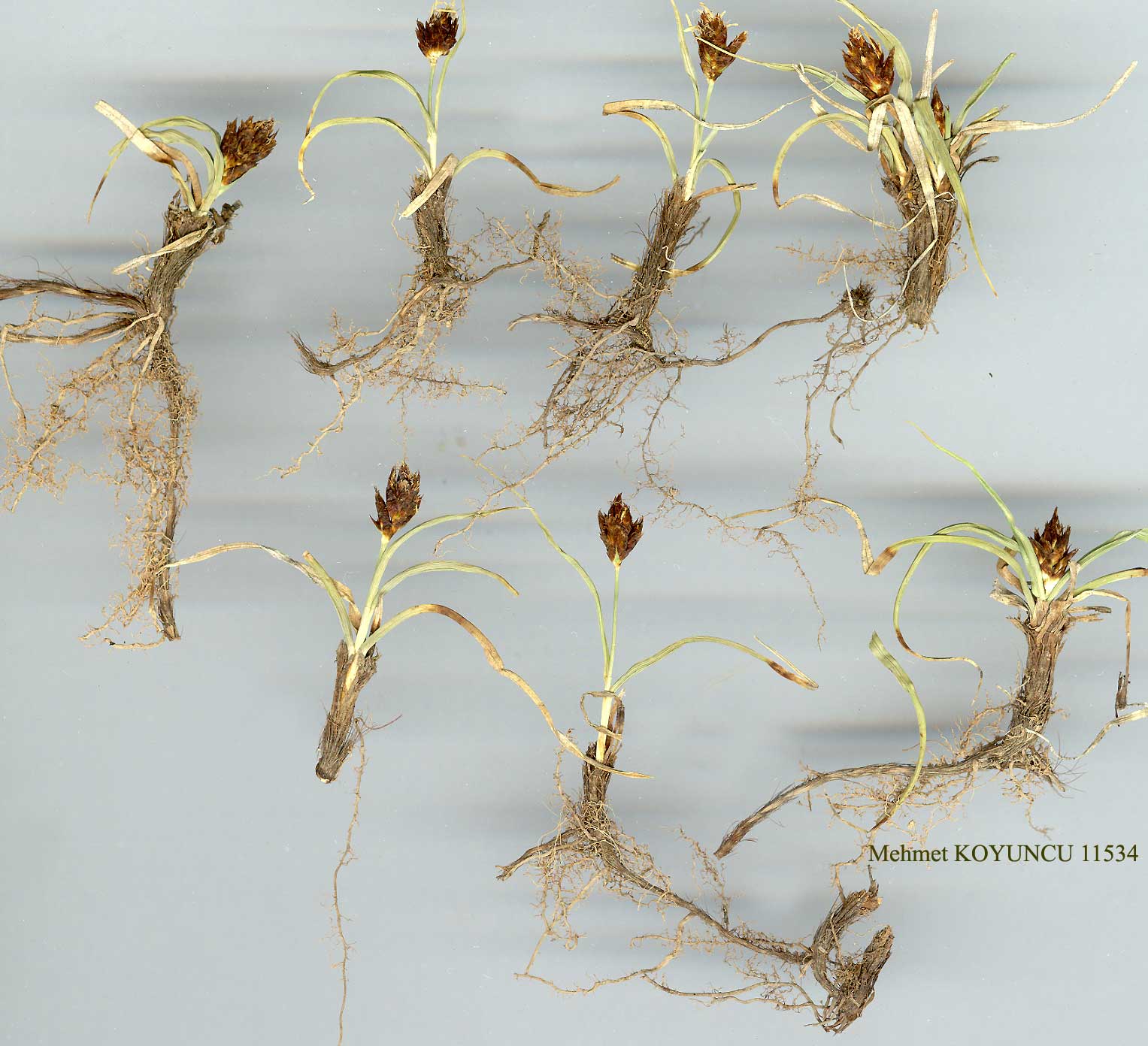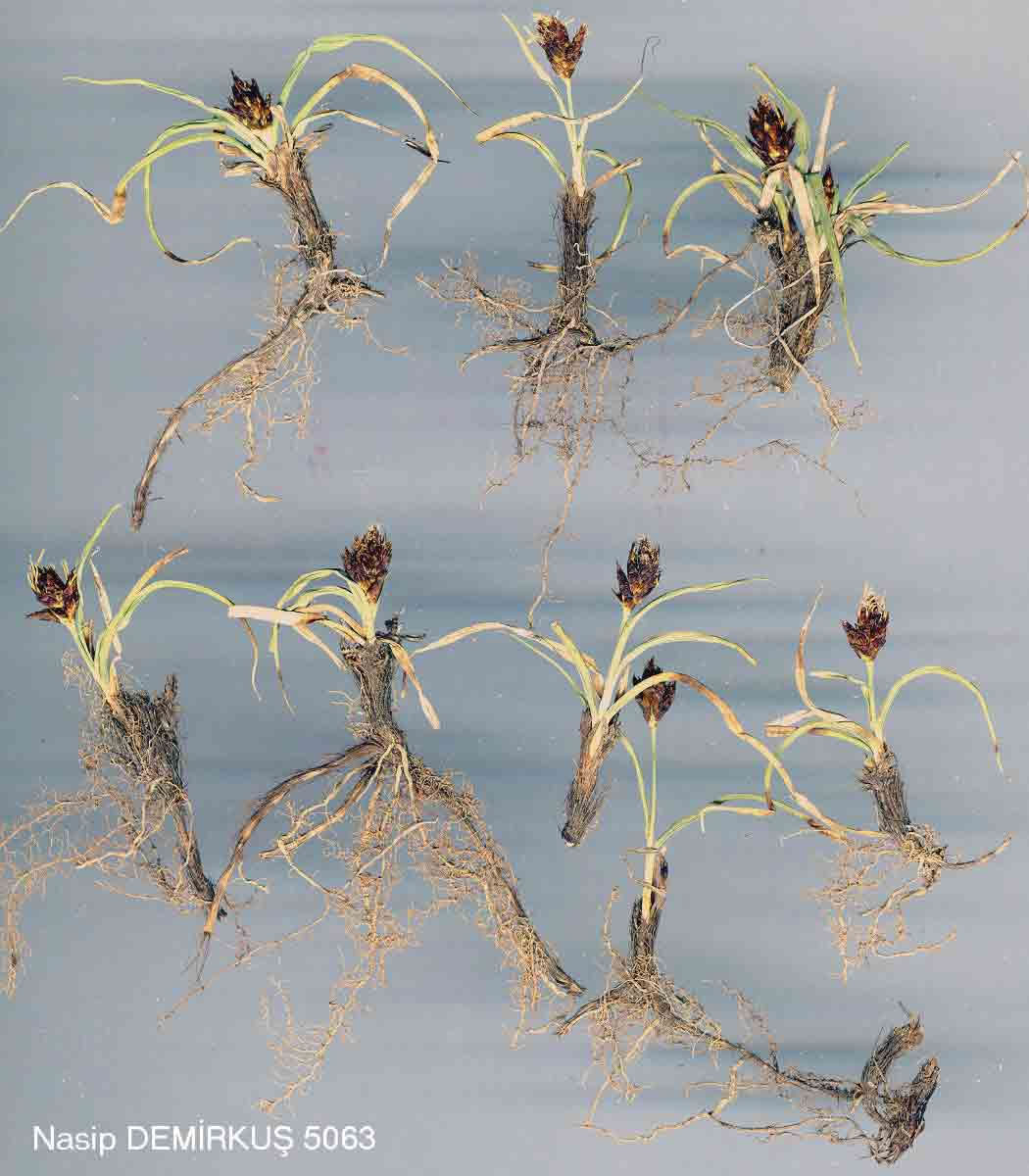 Rhizomes much-branched; roots blackish- to greyish-brown; shoots solitary or in lax, small tufts. Stems 6-20 cm, subterete, erect, slender, rather rigid, leafy only at very base; basal sheaths and basal parts of leaves loosely enclosing base of stem, soon becoming dark to blackish-brown and fibrous. Leaves 1-2.5 mm broad, rather soft, flat to subinvolute, narrowed into long setaceous tip, somewhat scabrid at margin, lowermost leaves short and thin, soon withering, often curved. Spikes 3-6, rather few-flowered, aggregated in a broadly ovoid head 0.8-1.8 cm; bracts broad, ± clasping, glumaceous or lowest with a short setaceous tip. Female glumes ovate, c. as long as or slightly shorter than utricles, uniformly dark chestnut or with pale scarious margins. Utricles dark chestnut and glossy in upper half, straw-coloured below, ellipsoid or ovoid, 4-5.5 mm, plano-convex, thin-walled, membranous, veinless above but with a few rather distinct veins at base of convex side, stipitate, rather abruptly contracted into a usually smooth, chestnut, slightly flattened, distinctly bifid beak to 1.5 mm, deeply cleft abaxially, beak points often convergent, scarious-margined. Nut brown, squarish with truncate base. Semi-deserts, steppe, dry slopes and meadows, 550-2700 m. Syntypes: [Syrian Desert] in Asia occidentali, inter Halepum (Aleppo) et Mosul, Olivier & Bruguiere (P!) et in Persia, Belanger (G, K!). E. Anatolia. B7 Malatya: Pütürge, 1350m, Altan llO9! B8 Erzurum: Bingöl Da., 2200 m, Engin 108! B9 Bitlis: Nemrut Da., 2700 m, Frödin 1936:243! Van: 3 km S.W. of Çalderan, 2250 m, Sorger 81-38-8! B10 Kars: N.E. slope of Ağri Da. below Serdar Bulak, 2300 m, D. 43796 p.p.! C6 Urfa: 3 km N. of Birecik, 550 m, Sorger 80-7-32! C7 Adiyaman: Kahta to Eski Kahta, 600 m, Rix 1892! C8 Mardin: 2 km E. of Mardin, 1150 m, D. 28439! Transcaucasia, Iran, Khorassan, N. Iraq, Lebanon, Palestine, Syrian Desert, Afghanistan, Transcaspia, Turkestan, Tien-Shan. Ir.-Tur. element. |