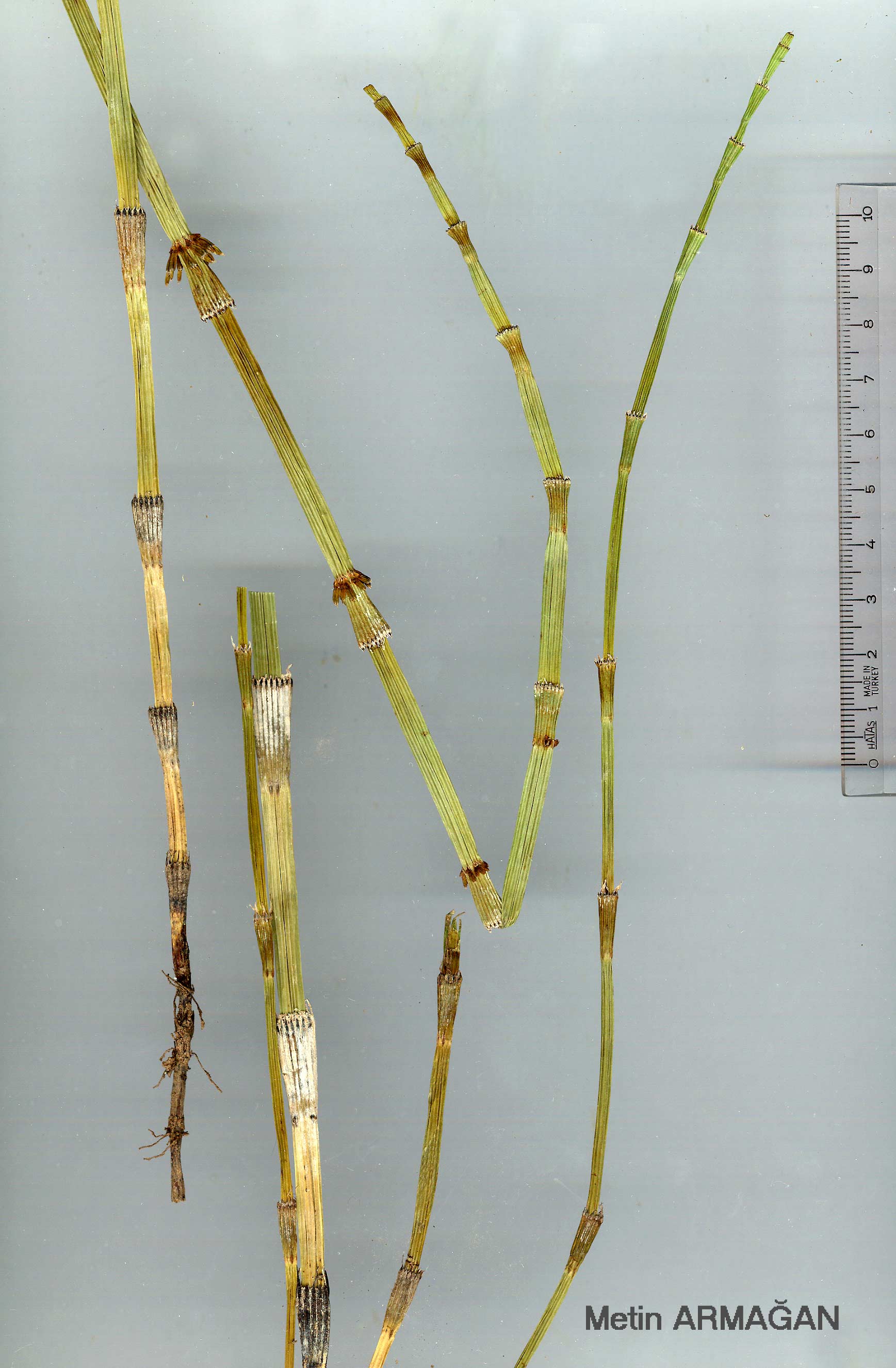 | E. fluviatile L., Sp. PL 1062 (1753). Syn: E. limosum L., loc. cit. I?: Fl. Dan. 7: t. 1184 (1797); Roles, S. J., British Flora Illustrations 1, t. 15 (1957). Stems up to 150 cm, erect, green, simple, or with whorls of branches in the middle and upper parts; grooves shallow, 10-30. Sheaths green; teeth as many as the grooves, black, not ribbed, subulate. Central hollow 1/5the stem diameter. Branches ascending, 5-angled, the lowest internode equalling or shorter than the stem sheath. Cone 1-2 cm. River banks, etc., up to 1500 m. Described from Europe (Hb. Linn. 1241/6!) Very scattered, perhaps under-collected. A8 Giimüşane: N of Bayburt, 1500 m, D. 31977! Is.: Lesvos, Cand. Temperate Eurasia, N. America. |