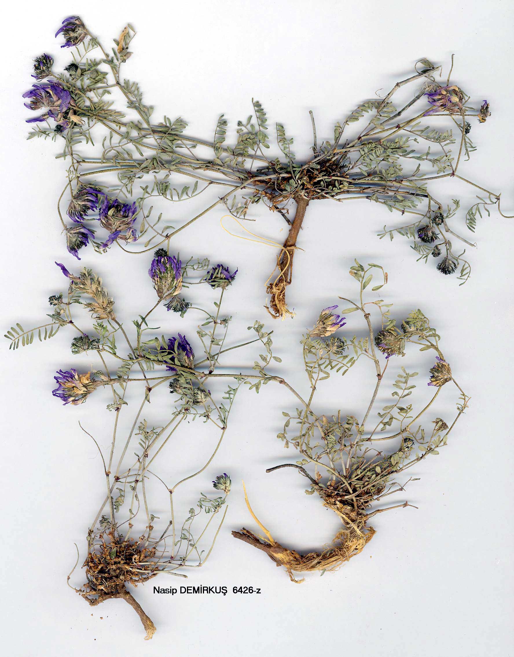 | A. fumosus Boriss. in Not. Syst. (Leningrad) 10:50 (1947). Procumbent to ascending, perennial herb, 10-30 cm; stems 10-25 cm. Leaves 1-2.5 cm; leaflets 2-7 mm, narrowly elliptic, adpressed bifurcate-pilose, (8-)12-J6-paired; stipules 1-3 mm, lanceolate, joined at the base. Inflorescence c. 1.5 cm diam., a dense, globose, 8-15-flowered spike, elongating in fruit. Bracts c. 2 mm, lanceolate. Calyx 5-6 mm, campanulate, adpressed bifurcate-pilose, with short black and long white hairs; teeth 2-3 mm, linear, predominantly black-hairy. Corolla violet; standard 9-13 mm, glabrous. Legume c. 5x2 mm, ovoid, erect, white simple-pilose; beak c. 2 mm, curved. Fl. 5-6. Igneous and dry stony slopes, oakwoods, etc., 650-2000 m. Type: [Turkey A8] Artvin, in declivibus siccis Iapidosisque ad fluvium Czoroch prope Ordshoch, 9 vi 1914, Turkevicz 742 (holo. LE!). E. Anatolia. A9 Coruh: 6 km from Ardanuç to Ardahan, 650 m. Hub.-Mor. 16156! B9 Van: 24 km from Gürpinar to Hoşap, 2000 m, D. 44697! B10 Ağri: 35 km E of Doğubayazit, 1600 m, D. 43971! Endemic. According to Borissova, A. fumosus is related to A. hajastanus Grossh. from Soviet Armenia. The specimen from B9 Van (D. 44393), differs from the type in being taller, c. 25 cm as opposed to c. 10 cm, and in having larger leaflets, 5-7 mm, not 2-5 mm. |