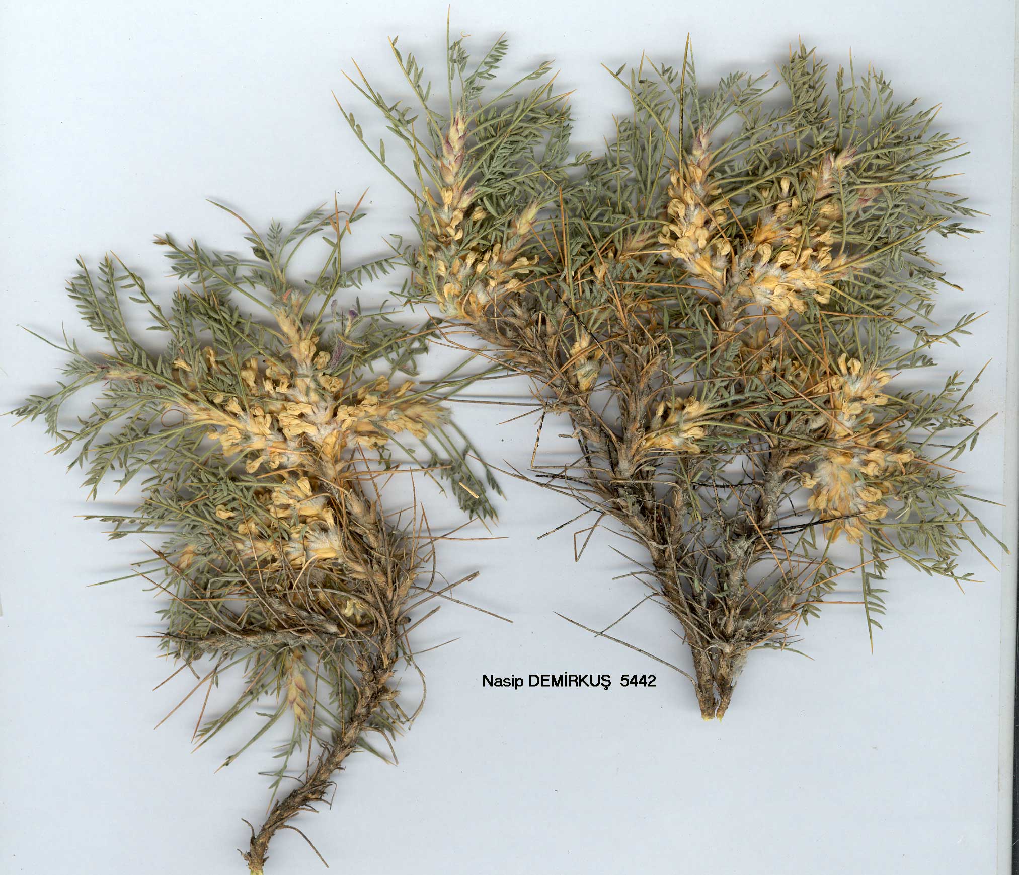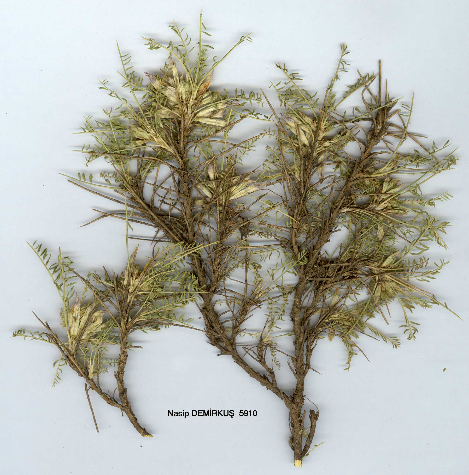 | A. rechingeri Širj. in Ann. Nat. Hofmus. Wien 49:269 (1939). Dwarf shrub growing up to 30 cm. Leaves 2-5 cm; rachis spiny; leaflets 4-8 mm, narrowly elliptic, obtuse, sometimes mucronulate, glabrous, 9-11-paired; stipules c. 6 mm, triangular-lanceolate, glabrous, united to halfway. Inflorescence with 5-6 shortly pedicellate flowers. Bracts 2-3 mm, lanceolate, membranous. Brac-teoles absent. Calyx 8-10 mm, tubular, with very sparse black adpressed simple hairs; teeth 2-3 mm, narrowly triangular. Corolla white or pinkish; standard 20-23 mm. Ovary hairy. Legume unknown. Fl. 6-7. Rocky slopes, 2340-3000 m. Type: [Turkey B9 Van] Kurdistan: Östl. Ausläufer der Kette des Agherov dag, im Süden von der Ebene von Pesandasht, 2900 m, 24 Juni 1936, Frödin 77 (UPS!). S.E. Anatolia. B9 Van: d. Şatak, Kavuşşahap Da., 2750 m, D. 23075! Bitlis Van: 10 km SE of Pelli, 2340 m, D. 22582! C10 Hakkari: Sat Da., NW of Sat G., 2900-3000 m, D. 45703! Endemic; Ir.-Tur. element. Near to A. icmadophilus. |