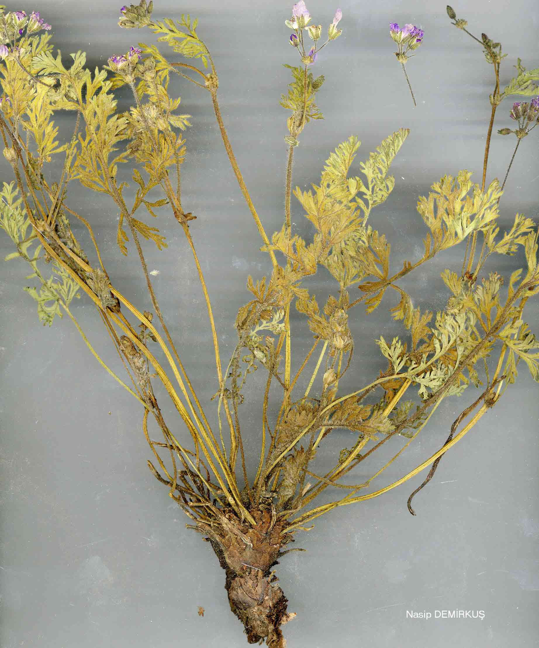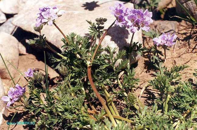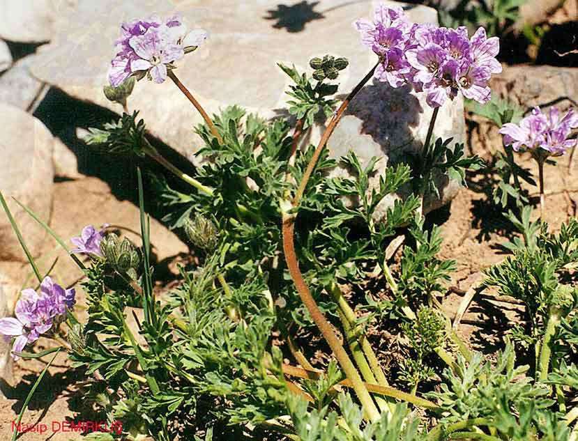 | E. absinthoides Willd., Sp. PL 3: 627 (1800). Dioecious perennial, usually with few lax rosettes. Basal leaves l-2(-3)-pinna-tisect, blade ovate to narrowly oblong, 2-13 cm, primary segments varying from shortly pinnatifid to deeply 2-pinnatisect, adpressed-pilose, canescent or sub-sericeous, usually eglandular. Stems simple or sparsely branched, prostrate or ascending, hirsute or canescent. Sepals 4.5-7 mm in flower, usually pilose and glandular-pubescent; awn 0.2-2.8 mm. Petals obovate, 1-2½ x sepals, white, pink or lavender-blue. Beak of fruit 4-7 cm, stout. A very variable species, to which several of its allies should perhaps be subordinated. Four subspecies are recognised here; another (subsp. elatum (Form.) Davis & Roberts) grows in N. Greece. 1. Lamina of basal leaves oblong, length 2-4 x width, segments laxly and deeply 2-pinnatifid into lanceolate acute laciniae; stems bearing 1-12 peduncles 2. Leaves densely canescent; stems grey with short, retrorsely adpressed hairs; flowers white subsp. absinthoides 2. Leaves greenish, adpressed-pilose; stems patently hirsute, often also bearing subsessile glands; flowers lavender-blue . subsp. armenum 1. Lamina of basal leaves ovate, length c. 1.5 x width, segments 1-2-pinnatifid into short obtuse laciniae or teeth; stems bearing 1-2 peduncles 3. Segments deeply pinnatifid, subsericeous; flowers bright pink subsp. latifolium 3. Segments lobed only to the middle, greenish; flowers white subsp. haradjianii subsp. armenum (Trautv.) Davis in Notes R.B.G. Edinb. 28: 36 (1967). Syn: E. absinthoides var. armenum Trautv. in Acta Horti Petrop. 2: 517 (1873)! E. armenum (Trautv.) Woronow in Acta Horti Petrop. 27: 432 (1910)! Ic: Grossh., Fl. Kavk. 5: t. 5 f. 2 (1962). Fl 7-8. Rocky slopes, 2300-3200 m. Type: [Soviet Armenia] in Armeniae monte Alagos, Radde (LE!). A8 Gümüşane: Kop Da., Balls 1786! B7 Erzincan: Sipikor Da., Sint. 1889: 1099! Erzurum: Palandöken Da., nr. Erzurum, Kotschy 542! B8 Bitlis/Van: d. Reşadiye, mt. 10 km SE of Pelli, 2400 m, D. 22563! B8 Siirt: Mt. Meletus (Mertug), 2400-3100 m, Hand.-Mazz. 2723! B9 Bitlis: d. Kotum, Karz Da. above Kamer, 2300 m, D. 24581! Kars: SW of Iğdir (Grossheim 6: map 30). Van: d. Şatak, Kavuşşahap Da., 3200 m, D. 23123. Soviet Armenia. Ir.-Tur. element. Cf. E. hakkiaricum. |