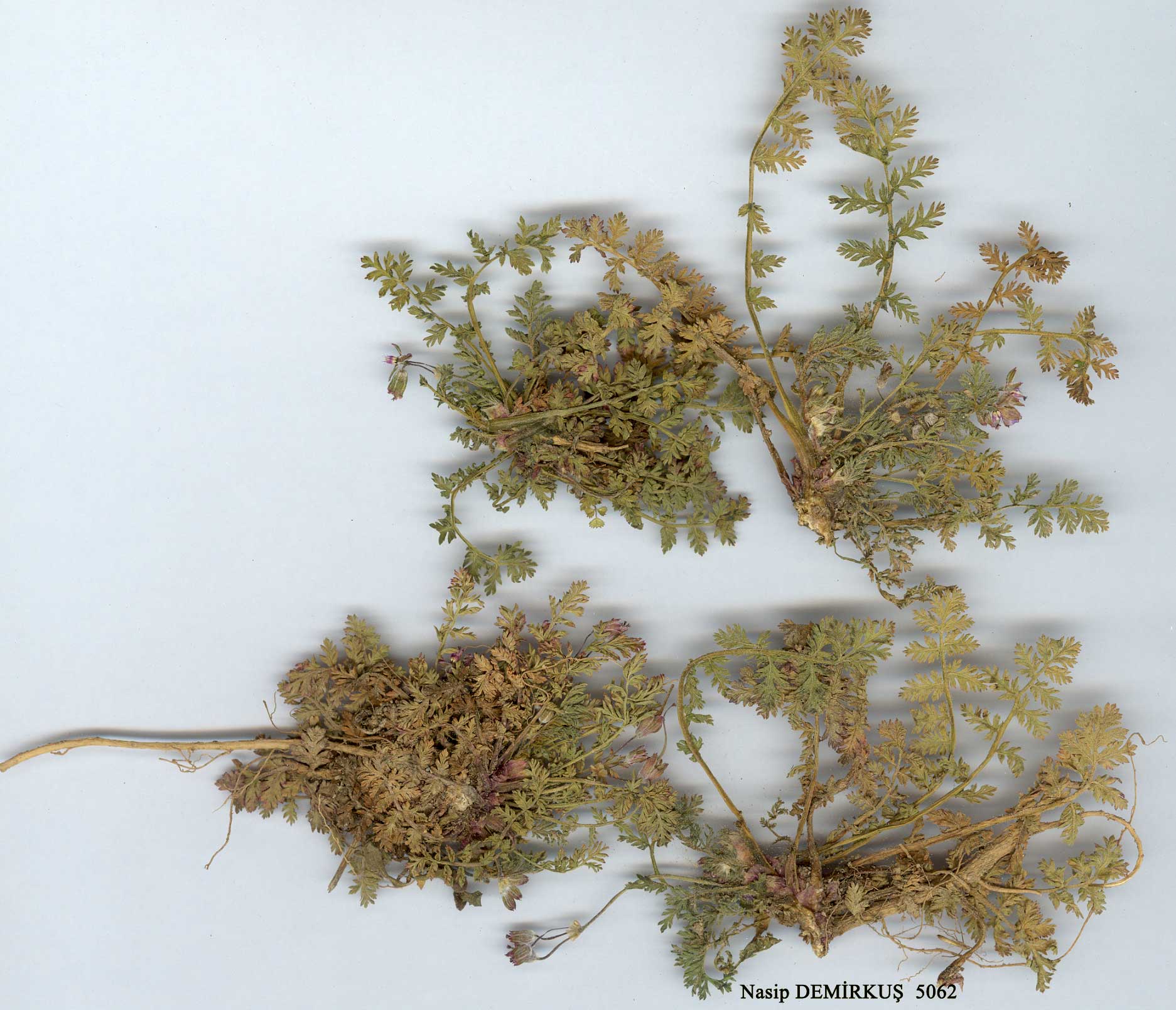 | E. cicutarium (L.) L'Hérit. in Aiton, Hort. Kew. 2: 414 (1789). Syn: Geranium cicutarium L., Sp. PL 680 (1753). Caulescent annual (though stems sometimes very short in early spring), up to 40 cm. Basal leaves pinnate, leaflets ovate-oblong, 4-10 mm, deeply pinnatifid into entire or few-toothed segments. Cauline leaves with leaflets deeply 1-2-pinnatifid. Stipules usually ovate. Sepals 4-5 mm, up to 7 mm in fruit; awn 0.2-0.5 mm, usually bearing 1 or more long terminal bristles. Petals ovate, not overlapping, mauve or pink, 1½-2 x sepals. Beak of fruit 2.5-3.5 cm. Mericarps c. 5 mm, foveoles eglandular, often with a narrow, shallow furrow beneath. - A very variable species. Two subspecies may be recognised in Turkey: 1. Mericarps with a furrow below the foveoles; basal and stem leaves usually dissimilar, leaflets with acute laciniae subsp. cicutarium 1. Mericarps without a furrow below the foveoles; basal and stem leaves similar, leaflets with obtuse laciniae subsp. bipinnatum subsp. cicutarium. Ic: Ross-Craig, Draw. Brit. Fl. 6: t. 42 (1952). Described from Europe (Hb. Cliff! Hb. Linn. 858/43!). A1(E) Çanakkale: Kilia nr; Gelibolu, Ingoldby 45! A1(A) Çanakkale: Erenköy, Kirk! A2(E) Istanbul: Rumeli Hisar, 23 v 1918, B. Post! A2(A) Istanbul: Büyük Ada, 8 iii 1936, B. Post! A3 Sakarya: Sapanca, 100 m, D. 26270! A4 Ankara: Çubuk De., Krause 5487! A5 Samsun: nr. Bafra, 3 m, Tobey 443a! A7 Trabzon: Kalanema De., obs. Hand.-Mazz. A8 Rize: d. Hemşin, Ortaköy to Cat, D. 22193. A9 Çoruh: Nof Ardanuç (Grossheim 6: map 31). B1 Izmir: Bergama to Akropol, 1950, Heilbronn & Attila! B3 Eskişehir: 18 miles from Polatlı to Sivrihisar, 800 m, Coode & Jones 2289! B4 Konya: Cihanbeyli, D. 18726. B5 Yozgat: 7 miles from Yozgat to Sorgun, 1300 m, Coode & Jones 1617! B6 Seyhan: Saimbeyli, 1100 m, D. 26686! B7 Erzincan: Erzincan, 1940, Bağda! B9 Van: Adramit, Tchitouny 127. Cl Izmir: Torbali to Ephesus, 50 m, D. 25147 p.p.! C2 Muğla: Kisge to Kazağaç, 550 m, D. 41055! C3 Antalya: Elmali to Korkuteli, 1120 m, Dudley, D. 35219. C4 Konya: Küçük Köy nr. Çumra, 980 m, Helbaek 2426! Ç5 Seyhan: Pozanti, 800 m, D. 26319! C6 Hatay: above Iskenderun, D. 26981! C8 Mardin: Mardin to Nusaybin, 750 m, D. 28478! Is: Lesvos, Cand.; Samos, Rech. 3936! Ikaria, Rech. 4426; Fournoi, Rech. 4722; Kalimnos, Fors.-Maj. 821; Kos, D. 40466! Rodhos, Rech. 7339. Europe, N. Africa, S.W. Asia; naturalised in America, Australia, E. Africa. Sub acaulous, spring-flowering plants are readily confused with E. acaule. |