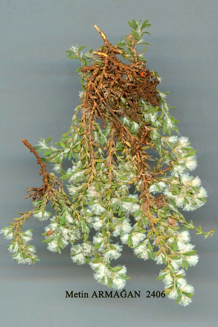 P. kurdica Boiss., Diagn. ser. 1(3): 10 (1843). Procumbent herb, often compact and woody at base. Leaves 4-7 x 1-2 mm, narrowly oblong to oblanceolate, ± obtuse, thickish, pubescent. Stipules 4 per node, mostly shorter than the leaves. Glomerules 10-15 mm diam., profuse and congested. Bracts obliquely ovate, acuminate, almost 2 x longer than the flowers. Flowers 3-3.5 mm, pubescent. Sepals unequal, 3 long, 2 (inner) short, narrowly oblong-lanceolate, .obtuse to acute, the outer recurved at tips. Fl. 5-7 Rocky places. A very variable species in which 3 subspecies are recognisable in Turkey : 1. Flowers 3.5-4 mm; sepals linear-lanceolate, sharply acute, much recurved subsp. monfis-munzur 1. Flowers up to 3.5 mm; sepals narrowly oblong-lanceolate, obtuse, recurved at tips only * Cf. Greuter's treatment in Candollea 20: 176-178 (1965) .Ed. 2. Leaves often imbricate; glomerules 5 mm; bracts slightly exceeding but not concealing flowers; flowers 2-2.5 mm; sepals slightly unequal subsp. haussknechtii 2. Leaves often not quite imbricate; glomerules 10-15 mm; bracts usually concealing flowers; flowers 3-3.5 mm; sepals markedly unequal subsp. kurdica 2a. Shoots not brittle; glomerules quite large, 10-15 mm diam var. kurdica 2a. Shoots very brittle; glomerules smaller, often few-flowered, axillary, di-chasial cymes var. fragilis subsp. kurdica. var. kurdica. Type: [Iraq] Mesopotamia, mount Sindjar, Haussknedit (holo. G! iso. Z!). A2 Bilecik: Bilecik, 320 m, Demiriz 1735! A3 Ankara: Nallıhan, 650 m, D. 37049! A4 Çankiri: Çankiri, 800 m, Bornm. 1929: 13916! A5 Amasya: Amasya, 400 m, Bornm. 1889:316! A6 Amasya: Erbaa, 300 m, Tobey 686! A7 Gümüşane: Gümüşane, Sint. 1894: 7293! A8 Çoruh: Katibkhan to Artvin, 200 m, Holtnberg! B4 Ankara: Keçiören to Hacikadin De., 900-950 m, Demiriz 2863! B5 Niğde: Hasan Da. above Taşpinar, 1300-1400 m, D. 18896! B6 Malatya: Elbistan to Darende, Post 1906: 492! B7 Tunceli: Ovacik, 1400 m, D. 31459! B9 Van: 5 km N of Şatak, D. 23195! C3 Isparta: Isparta, 1938'- Başarman! C4 Konya: Konya to Cihanbeyli, S of Tutup, 1000 m, Demiriz 2728! C6 Seyhan: Bahçe, Haruniye, 500 m, D. 26755! C8 Mardin: Mardin to Nusaybin, 850 m, D. 28495! |
