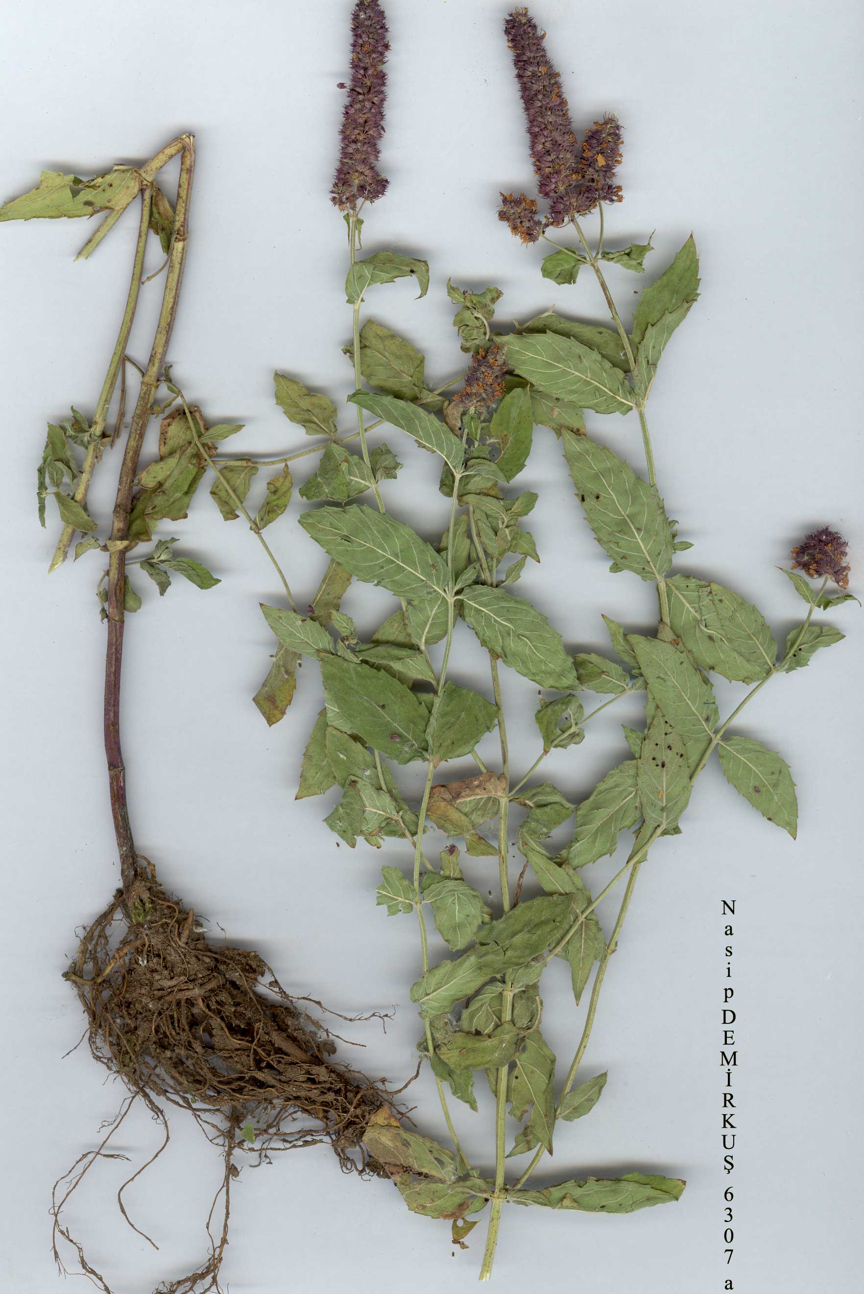 M. longifolia (L.) Hudson, Fl. Angl. 221 (1762). Variable, hairy perennial with musty or pungent odour. Rhizomes mainly hypogeal with squamiform leaves. Flowering stems 40-120 cm. Leaves (25-)30-90 x 10-32(-40) mm, sessile or rarely petiolate, oblong-elliptic to oblong-lanceolate, broadest at or above middle, apex ± acute, base cordate to sub-cordate, margin sharply serrate with many irregular and often spreading teeth. Lamina smooth or very weakly rugose, green- to grey-tomentose above, green-to white-tomentose beneath (discolorous in subsp. longifolia), sometimes minutely puberulous on both surfaces. Leaf hairs unbranched, finely matted beneath when dry, basal cell 18-36(-41) μm diam. Verticillasters many, congested, forming a terminal often much branched spike (30)40-100 x (7-)9-15 mm diam. Calyx 1-3 mm. Corolla lilac or white. Nutlets chestnut, reticulate. 1. Leaves distinctly petiolate subsp. noeana 1. Leaves sessile or almost so 2. Leaves more than 50 mm x 18 mm, discolorous with thin-walled hairs beneath, collapsing when dry; spikes robust, 12 mm diam. with usually sessile or subsessile branches subsp. longifolia 2. Leaves usually less than 50 mm x 20 mm, concolorous with long to very short and curved, thick-walled hairs beneath, scarcely collapsing when dry; spikes more slender, to 10 mm diam., branches pedunculate subsp. typhoides 3. Leaves green, densely puberulous on both surfaces, with short hairs, sometimes appearing almost glabrous; undersurface with sessile glands, visible with a lens; flower spikes tinged reddish-purple var. calliantha 3. Leaves grey-tomentose; glands on undersurface obscured by hairs; flowers not conspicuously reddish-purple var. typhoides subsp. typhoides (Briq.) Harley in Notes R.B.G. Edinb. 38:38 (1980). Syn: M. sylvestris L. subsp. typhoides Briq. in Bull. Soc. Bot. Geneve 5:90 (1889)! var. calliantha (Stapf) Briq. in Bull. Herb. Boiss. 4:687 (1896). Syn: M. calliantha Stapf in Denkschr. Akad. Wiss. Wien, Math.-Nat. Kl. 50(l):36 (1885)! M. silvestris L. subsp. calliantha (Stapf) Briq. in Bull. Soc. Bot. Genève 5:67 (1889)! Fl. 6-9. Marshy ground, streamsides, 1500-3000 m. Type: [N.W. Iran] ad paludes prope Hamadan, Polak & Pichler (holo. WU, iso. K!). E. Anatolia. B8 Muş: Varto, 1560 m, D. 46299! B9 Bitlis: Nemrut Da., 2450 m, 4 viii 1972, Tatli! Van: Erek Da., 1980 m, D. 22964! Van to Başkale, Halanduran Da., 3000 m, McNeill 655! Ağri: 96 km W. of Doğubayazit, 1520 m, Furse 3578! C9 Van: Havasor to Hoşap, D. 23283! Hakkari: Kara Da., 2900 m, D. 24361! C9/10 Van/Hakkari: Başkale to Hakkari, 1800 m, McNeill 691! 692! C10 Hakkari: Bacirge, 1700-1800 m, D. 45279! N.W. Iran. Although a very distinctive variety, it appears to merge into typical subsp. typhoides occurring further W. In this respect, the two McNeill collections from Hakkari are particularly interesting, one being fairly typical, and the other, from the same population, being very much hairier. |