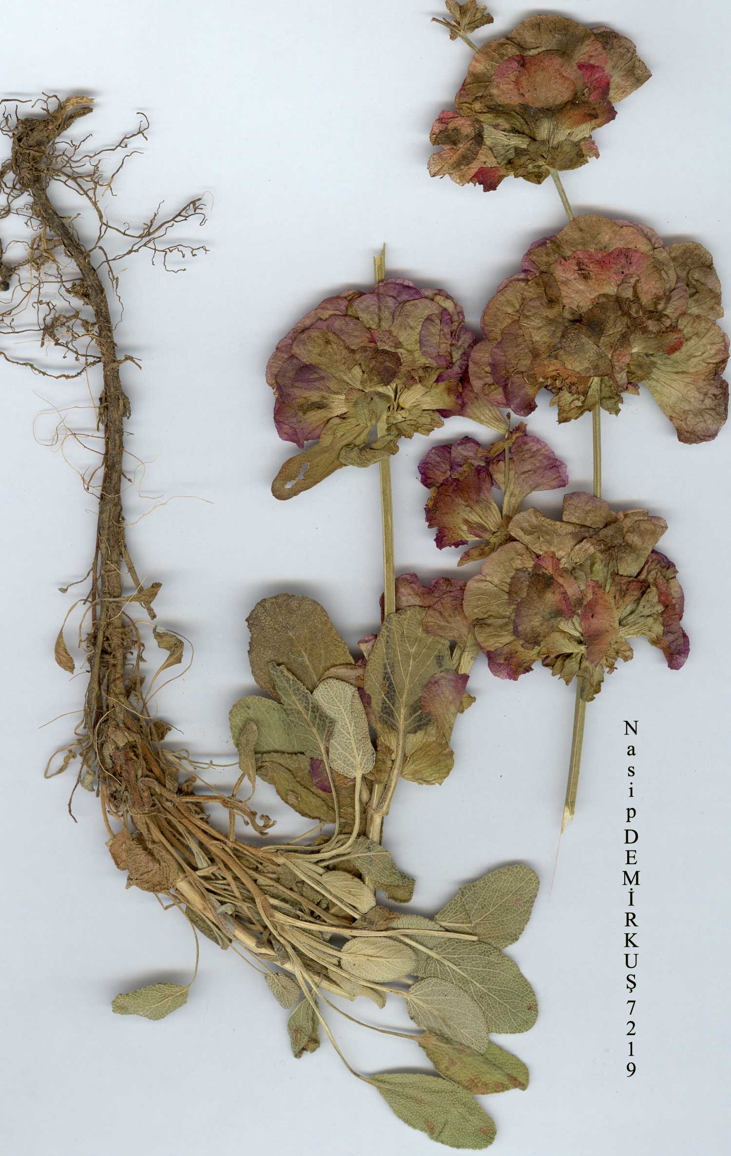 | S. multicaulis Vahl, Enum. PL 1:225 (1805). Syn: S. acetabulosa Vahl, op. cit. 227 (1805) non L. (1767) excl. syn.;S. szovitsiana Bunge, Lab. Pers. 43 (1873); Schraderia 'acetabulosa' (Vahl) Pobed. in Fl. URSS 21:369 (1954); Arischrada multicaulis (Vahl) Pobed. in Novit. Syst. Pl. Vase. (Lenin-grad) 9:247 (1972). Ic: Fl. URSS 21: t. 18 f. 1 (1954), as Schraderia acetabu-losa. Map 53. Perennial herb, mat-form'ing, with a woody rootstock. Stems erect, un-branched, 12-55 cm, usually glandular-pilose to -villous, especially above, rarely glabrous, occasionally with dendroid hairs. Leaves simple, rarely with 1-2-pairs of small basal lobes, broadly ovate-elliptic to suborbicular, 2-4.5(-7) x 1-3.5 cm, rugose, crenulate, with a dense indumentum of ± adpressed den-droid to dendroid-stellate hairs; petiole 1.5-6 cm. Verticillasters 4-10-flowered, usually distant. Bracts broadly ovate, c. 15 x 10 mm; bracteoles present. Pedi-cels 2-4 mm, erecto-patent. Calyx campanulate, c. 15 mm, to c. 17 mm in fruit and broadening, sparsely to densely glandular-pilose or -villous, purplish-violet, rarely yellow-green; upper lip indistinctly 3-lobed. Corolla purplish-violet,rarely white, c. 18 mm; tube ± straight, c. 12 mm, annulate; upper lip ± straight. Stamens A. Nutlets rounded trigonous, 3.5 x 3 mm, dark brown. 2n = 16, 18, 32. Fl. 4-7. Rocky limestone and igneous slopes, shale and sandy slopes, scree, fallow fields, in Quercus scrub, Artemisia steppe, amongst Cedrus, 550-2600 m. Type: 'Hab. in Oriente. Ex Herb. Desfontainii' (holo. C-Vahl!). E. & adjacent C. & S. Anatolia. A6 Sivas: Zara to Şerefiye Y., 43 km N. of Zara, 1880 m, Hub.-Mor. 11877! A7 Gümüşane: Gümüşane, 1400 m, Stainton 8323! A8 Erzurum: 27 km from Erzurum to Tortum, 1950 m, D. 47529! A9 Kars: W. of Kağizman (Grossheim 7: map 449). B5 Kayseri: d. Develi, Bakir-dağ to Saimbeyli, 1640 m, Hub.-Mor. 10745! B6 Sivas: Gürün to Sivas, 17 km N. of Gürün, 1680 m, Hub.-Mor. 11876! B7 Malatya: Malatya to Pütürge, Kube Da., 1730 m, Hub.-Mor. 8975! B8 Erzincan: Tercan to Aşkale, 1600 m, D. 29341! B9 Van: 7 km from Van to Erçek, 1850 m, D. 44260! C5 Adana: d. Feke, Bakir Da., 1900 m, D. 19410! Cβ Adana: d. Osmaniye, Yarpuz, 1600 m, Hub.-Mor. 14208! C7 Malatya: 74 km S.W. of Malatya, 1550 m, Sorger 71-45-25! C8 Mardin: 10 km from Gerçüş to Hasankeyf, 750 m, D. 43011! C9 Mardin: Cudi Da. above Hessana, 1300 m, D. 42841! C10 Hakkari: Zap river nr turning to Yüksekova, Trelawny 1307! W. Syria, Syrian Desert, N. Iraq, Iran, Sinai. Ir.-Tur. element. Varying considerably in leaf and stem indumentum; specimens with the most clearly dendroid-stellate hairs are apparently from the most arid environments. A characteristic and often common steppe species of E. Anatolia. The bracts, calyces and flowers are generally violet or purple but not infrequently green and white. For a note on the nomenclature of S. multicaulis see Notes R.B.G. Edinb. 22:427(1958). |