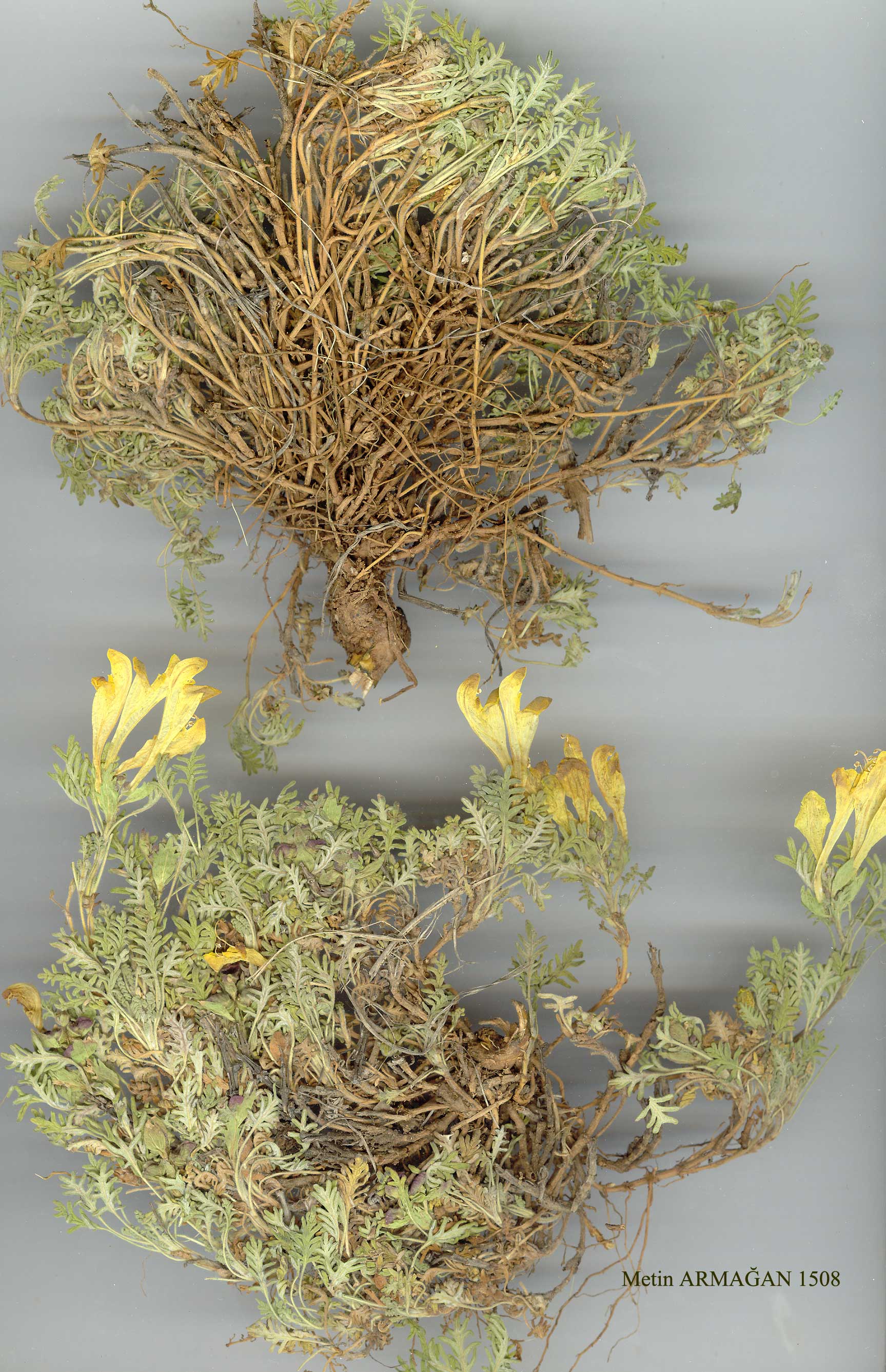 S. orientalis L., Sp. PI. 598 (1753). i0 ' ~'yJ^J A very variable suffrutescent perennial herb, usually repent at base. Stems 5-45 cm, obscurely tetragonal. Leaves distinctly petiolate, lamina ovate-elliptic to linear, 5-30 mm, usually obtuse, cuneate or attenuate (rarely truncate) at base, (with rare exceptions) 1.5-2 x as long as broad, weakly crenate to incised-pinnatifid or pectinate-pinnatifid, glabrous to densely canescent-tcmentose, often markedly discolorous. Inflorescence a terminal spike with tetragonal ranks of flowers (not secund), usually dense with ± imbricate bracts; bracts very variable in size and shape but often either pale greenish or deeply purple-tinged, sessile. Corolla 20-32 mm, usually yellow, sometimes reddish-spotted or with red upper or lower lip or entirely pink, bright red, brick-red or purplish, ± pubescent. Nutlets oblong, tomentellous. A polymorphic complex extending from Spain and N.W. Africa to Sinkiang. The following 16 subspecies have been recognised mainly by a combination of characters of habit, height and mode of branching of stem, shape and degree of incision of leaves, leaf indumentum, size and shape of bracts and corolla colour. Where appropriate, the distribution of the subspecies within Turkey has been cited in a parenthesis in the key. Short descriptions are given as a further aid to correct identification. Some material cannot be accommodated within the subspecies as presently delimited, and examples of such specimens have been cited which fall outside the range of measurements etc. given in the descriptions. The existence of such morphological intermediates prompted me to adopt a broad species concept in this group. 1. Cauline leaves at least 4 x as long as broad (Inner Anatolia) m. subsp. santolinoides 1. Cauline leaves less than 4 x as long as broad 2. Leaves pinnatifid, divided at least to midway to midrib 3. Lower bracts pinnatifid to dentate; stems to 25 cm tall (S.E. Anatolia) j. subsp. pichleri 3. Lower bracts entire, rarely lowermost pair with 1-2 teeth; stems not exceeding 20 cm tall 4. Leaves pectinately lobed with narrow linear segments, divided almost to midrib, strongly discolorous, greenish above, whitish beneath (N.E. Anatolia) c. subsp. sosnowskyi 4. Leaves divided to distinctly short of midrib, lobes ± revolute, con-colorous or weakly discolorous, greenish above and beneath (widespread) h. subsp. pinnatifida 2. Leaves serrate, crenate or crenately lobed, divided to less than half-way to midrib 5. Lamina of median cauline leaves not more than 8 mm (rarely more); plant prostrate, mat-forming 6. Margins of leaves subacutely serrate; calyx densely sericeous (S.E. Anatolia) k. subsp. porphyrostegia 6. Margins of leaves obtusely lobed; calyx not sericeous 7. Plant greyish-incanous; margins of leaves often strongly recurved; corolla dusky crimson with yellow lower lip, rarely yellow (medium altitudes) g. subsp. pectinata 7. Plant ± greenish, not incanous; margins of leaves not strongly recurved; corolla yellow, lower lip sometimes reddish-tinged (widespread at high altitudes) i. subsp. alpina 5. Lamina of cauline leaves more than 8 mm (except uppermost); plant prostrate to erect, mat-forming or not 8. Leaves markedly discolorous, silvery-tomentose beneath (N.E. Anatolia) b. subsp. orientalis 8. Leaves concolorous or somewhat discolorous, not silvery beneath 9. Stem 20-45 cm, erect; bracts lanceolate to ovate, ± falcately curved upwards 10. Inflorescence lax; lamina lanceolate to oblong, 3-4 x as long as broad (E. Anatolia) n. subsp. sintenisii 10. Inflorescence dense; leaves 1.5-2.5 x as long as broad 11. Stem 20-35 cm, usually branched at base; leaves sparsely tomen-tellous above and beneath, margins shallowly dentate; bracts concave, not keeled (S.E. Anatolia) p. subsp. bornmuelleri 11. Stem 30-42 cm, usually branched in upper third; leaves densely tomentose to canescent beneath, margins crenate; bracts keeled (E. Anatolia: Mesopotamia) o. subsp. haussknechtii 9. Stem to 20 cm, prostrate or ascending; bracts broadly ovate to orbicular, not falcately curved upwards 12. Leaves dimorphic, lowermost linear-oblong with revolute crenat-ions, densely greyish-hairy, cauline triangular-ovate (S.W. Anatolia) 1. subsp. carica 12. Lowermost cauline leaves similar to the rest, not densely greyish-hairy 13. Leaves glabrous (mainly S.E. Anatolia) a. subsp. virens 13. Leaves ± puberulous to tomentellous at least beneath 14. Lower surface of leaves evenly hairy on and between veins 15. Leaves ± concolorous (mainly S.E. Anatolia) a. subsp. virens 15. Leaves discolorous (E. Anatolia, mainly Anti-Taurus) d. subsp. bicolor 14. Lower surface of leaves unevenly whitish-hairy, with distinctly fewer hairs on veins 16. Stems prostrate, 5-15 cm; petiole to 20 mm (Inner Anatolia) e. subsp. macrostegia 16. Stems ascending to erect, 10-20 cm; petiole 3-5 mm (E. Anatolia: Mesopotamia) f. subsp. cretacea subsp. pichleri (Stapf) Edmondson in Notes R.B.G. Edinb. 38:54 (1980). Syn: S. pinnatifida sensu Boiss., Fl. Or. 4:683 (1879) p.p. non A. Ham. (1831); S. pichleri Stapf in Denkschr. Akad. Wien, Math.-Nat. Kl. 50(l):47 (1885)! S. persica Bornm. in Beih. Bot. Centr. 22(2):128 (1907). Figure 3. Map 13. Stems puberulous, 15-25 cm, ascending to erect, unbranched or shortly branched above. Leaves long-petiolate(5-10mm), lamina ± ovate to triangular-ovate, incised-dentate to pinnatifid, sparsely villous, greenish on both sides. Inflorescence often lax, elongating in fruit; bracts pale green or purple, lowest dentate, ± membranous. Corolla yellow (in Turkey) or purplish with yellow lips, 25-30 mm, pubescent. Fl. 5-6. Dry stony slopes, 1700-1800 m. Described from Iran without precise locality. S.E. Anatolia. C10 Hakkari: Esendere, 1800 m, 25 v 1966, Eiselt! Bacirge, 1700-1800 m, D. 45277! N. Iraq, N., N.W. & W. Iran. Ir.-Tur. element. Records of S. pinnatifida A. Ham. from Elmadağ (B4 Ankara), Tchihatcheff and from Oltu (A8/9 Erzurum), Sosnowsky are more likel