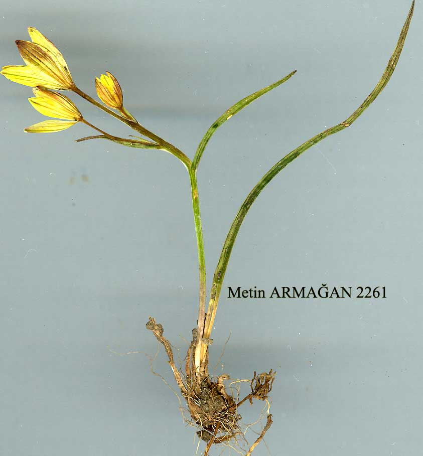| G. uliginosa Siehe & Pascherin Sitz.-Ber. Deutsch. Naturw.-Med, Ver. Böhm. 'Lotos' n.s. 24:129 (1904). Syn: G. tauricola Schott & Kotschy in Tchihat., Asie Min. Bot. 2:534 (1860) nom. nud.; G. sokimsni Boram, m Mitt. Thür. Bot. Ver. n.s. 18:46 (1903) nom. nud.; G. uliginom Siehe & Paseher var. solei-mani Bornm. ex Pascher in Byull. Mosk. Obshch. Prirod., Bioi. 19:371 (1907); G. soleimani (Bornm. ex Pascher) Bomm. m Bull. Herb. Boiss. ser. 2, 8:730 (1908). Bulbs solitary or in small groups; tunics forming a fibrous neck 8-20 mm, without recurved thickened roots. Whole plant glabrous. Basal leaf 1, linear, 1-1.5 mm broad. Inflorescence 2-5 cm, branching at middle. Cauline leaf 1, not overtopping flowers, filiform; bracts 1 per flower, bracteole I on terminal pedicel. Flowers 1-2. Pedicels not greatly elongating in fruit. Perianth segments bright yellow, reddish outside, 8-15 mm, iaaer narrowly diamond-shaped, outer narrowly ovate. Capsule not seen. Fl. 6-8. Damp mossy places, usually by late snow patches, 2500-3500 m. Type: [Turkey C5 Konya] Cilicien, Ketsebile (Moorwiese 2600 m), vii 1896, Siehe 308 (iso. BM! E! G! K!). S. & S.E. Anatolia; apparently disjunct. B9 Bitlis: Tatvan, Nemrut Da., 2500 m, Rix 1977! Van: Artos Da., 3500 m, D. 22876! C5 Niğde: Ala Da., 3050 m, Wood & Gibson 76! Konya: Ketsibeli, Kotschy (as G. tauncola). C9 Van: Kulinazu Da., 2800 m, Frödin 1936:230. Hakkari: Culameric (Hakkari), above HaSitha (Aşutka), 2500 m, Nabélek 2184! N. Iraq, Iran. Ir.-Tur. element. Related to G. chlorantha, and to G. olgae Regel from C, Asia. |