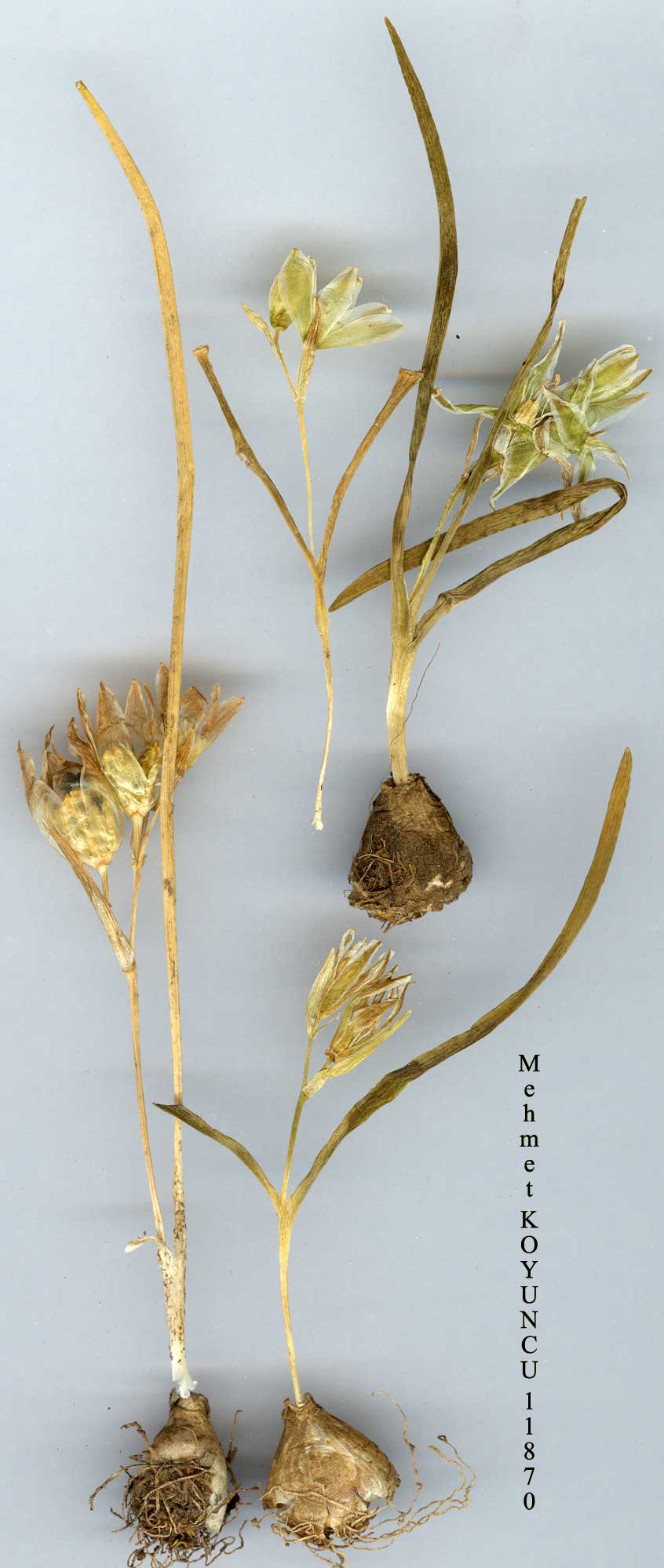 O. oligophyllum E.D. Clarke, Travels 2(3):555 (1816). Syn: O. aucheri Boiss., Diagn. ser. 1(5):65 (1844)! O. bifolium C. Koch in Linnaea 19:10 (1846); O. aemulum Schott & Kotschy in Öst. Bot. Wochenbl. 4:162 (1854); O. brevipedicellatum Boiss. ex Baker in J. linn. Soc. (Bot.) 13:263 (1873)! O. balansae Boiss., Fl. Or. 5:222 (1882)! Ic: Grey-Wilson & Mathew, Bulbs t. 15(1981). Figure 11. Scape erect, 4-15 cm. Leaves 2-3 (rarely more), often glaucous, narrow at base, broadening appreciably upwards and the abruptly tapering to rounded or subacute apex, narrowly spathulate, longer or shorter than scape, without a white line on upper surface; margins entire, glabrous. Raceme with 2-5 or rarely more flowers, at first very condensed, pedicels shorter than to as long as flowers at anthesis. Perianth segments 11-16 mm, white inside, white with a green fascia outside. Fruiting pedicels erect-spreading, 10-30 mm (longer in shaded specimens). Capsule winged. 2n=20, 24. Fl. 4-7. Grassy and rocky slopes, snow patches, 700-3000 m. Type: [Turkey/Bulgaria] in the route between Constantinople (Istanbul) and Rustchuk (Ruse, Bulgaria), E.D. Clarke (holo. BM). Mainly N., S. & Inner Anatolia. Lycia, in regione alpina, Bourgeau 1860: 264 (type of O. brevipedicellatum)! A2(A) Bursa: Ulu Da., 1600 m, Moore 7265 (2n = 20)! A3 Bolu: Abant G., Heilbronn & Başarman! A4 Bolu: 34 km S.E. of Gerede, 1600 m, Sorger 62-82-32! A5 Samsun: Ladik, 1200 m, Tobey 573! A6Sivas: 30kmN.E.of Zara towards Suşehri, 1530 m, Kukkonen 5427! A7 Trabzon: Zigana pass to Istavriköy, 2350 m, A. & T. Baytop (lSTE 15352)! A8 Rize: Ikizdere to lspir, 3000 m, Stn. & Hend. 6239! A9 Kars: Yalnizçam Da. between Yalnizçam and Ardanuç, 2250 m, D. 29668! B2 Kütahya: Murat Da. above Banaz, 2150 m, Coode & Jones 2513! B3 Konya: Beyşehir to Akseki, 1500 m, Demiriz 4508! B5 Kayseri: Bakir Da. at Akoluk Y. above Kisge, 2000 m, D. 19440! B6 Sivas: Bey Da. S. of Zara, 2000 m, Stn. & Hend. 5319 (2n = 24)! B7 Sivas: Kizildağ, 2150 m, Lamond 2630! B8 Erzurum: pass between Erzurum and Çat, 1800 m, Rix 1684! B9 Bitlis: Karz Da. above Kotum, 2225 m, D. 22290! B10 Kars: N.E. slope of Ağri Da., at Serdar Bulak, 2500 m, D. 43763! C2 Denizli: Honaz Da., 1650 m, Tuzlaci (lSTE 27994)! C3 lsparta: Dedegöl Da., 1400 m, Sorger 64-42-21! C5 lçel: 15 km S.W, of Pozanti, 1600 m, lt. Leyd. 1959:1290! C6 Hatay: d. Belen, Karlik Tepe, above Soğuk Oluk, 1200 m, D. 2706îa! C7 Urfa: Karaca Da., 2100 m, E.S. Brown 2509! C10 Hakkari: 10 km N. of Yüksekova, 1930 m, Trelawny & McPhail 2023! Balkans, Georgia. Some specimens are difficult to distinguish from O. wiedemannii and may be intermediate (e.g. A4 Zonguldak: Kel Tepe, 1550m, Tobey 1850! B9 Van: N. side of Erek Da. above Değirmenköy, 2500 m, D. 44481!). A specimen from A5 Amasya: Taşli Y., Ladik, 1600 m,Tobey 573a!is very robust with large racemes; it nonetheless appears to be O. oligophylium. The label states 'heavily fertilised by sheep.' O. schmalhausenii Albov is recorded for Turkey by Grossheim (Fl. Kavk. 2: map 193, 1940). The type (photo E!) is poor, but it appears to be O. oligophylium. Other material I have seen determined as O. schmalhausenii is O. sigmoideum. Material from the S.W. part of the range of the species ('Lycià, Antalya, lsparta, Konya) has a somewhat different facies from the rest, though it has not been possible to find workable characters to separate it; if separable it will have to be named O. brevipedicellatum Boiss. |