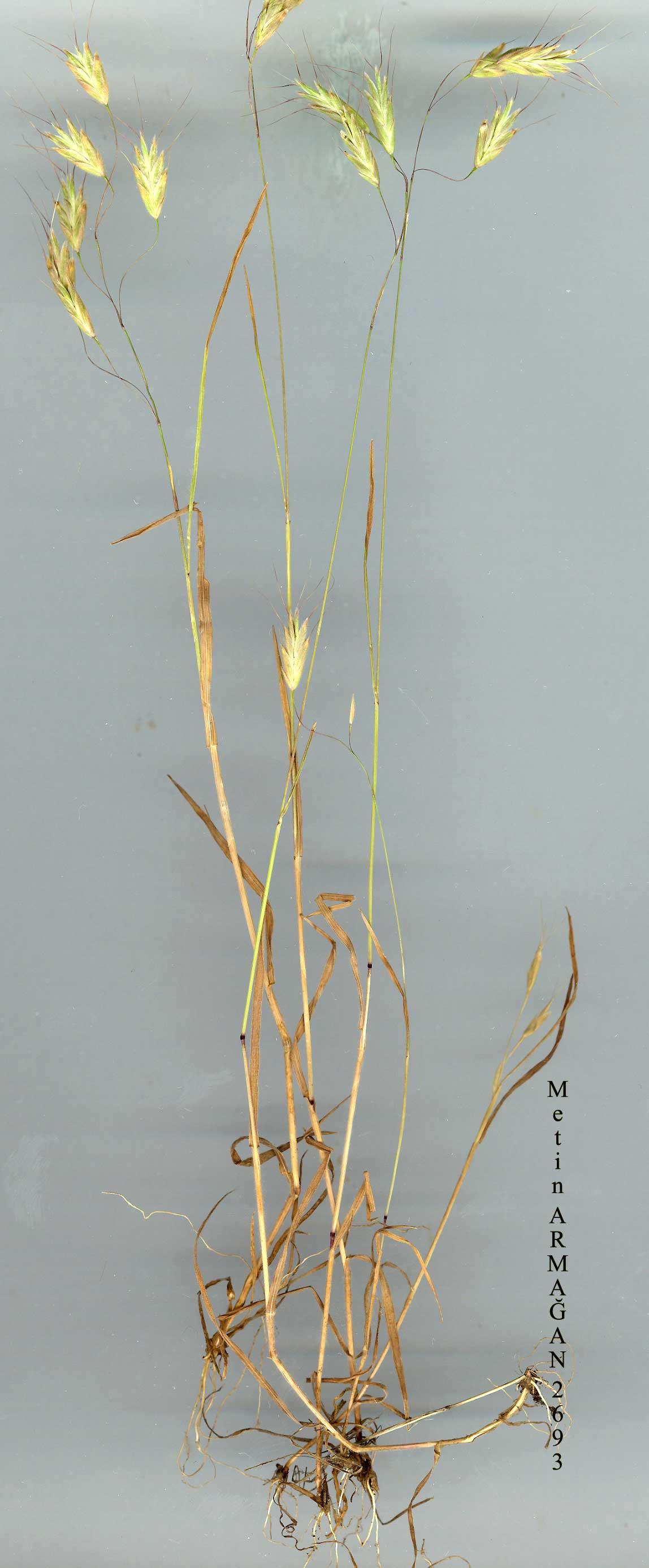 | B.japonicusThunb., Fl. Jap. 52, t. 11 (1784). Figure 11. Annual. Stems to 70 cm, erect or geniculate. Leaf sheaths pubescent or densely hairy. Leaf blades 5-15 cm x 3-6 mm. Panicle to 20 x 10 cm, ovoid, erect, spreading or drooping, sometimes secund; panicle branches slender, pedicels mostly longer than spikelets. Spikelets 15-35(-40) mm, ovate or ovate-lanceolate. Glumes lanceolate, lower 4-5 mm, upper 6-7 mm. Lemma 8-12 mm, horny. Awn 5-16 mm, flattened at base, spreading or recurved when mature, lower awns often much shorter and more erect than upper. Palea clearly shorter than lemma. Anthers 0.75-1.5 mm. 2n = 14. Fl. 5-7. Cultivated land, fallow fields, grassy steppe, dry slopes, s.l-2300 m. 1. Panicle compound, to 20 cm, spreading or drooping, sometimes secund; spikelets usually numerous; lemma 8-10 mm, with rounded or weakly angled margins; awns rarely exceeding lemma subsp. japonicus 1. Panicle usually simple, to 12 cm, erect or spreading; spikelets few;lemma 10-12 mm, with clearly angled margins; some awns longer than lemma subsp. anatolicus subsp. anatolicus (Boiss. & Heldr.) Penzes in Bot. Közlem. 33:118, t. 3 f. 21, 22 (1936). Syn: B. anatolicus Boiss. & Heldr. in Boiss., Diagn. ser. 1(13);63 (1854)! Type: [Turkey C3 Antalya] in rupestribus collium prope Tsimboukhan Pamphyliae, [v 1845], Heldreich [623] (holo. G! iso. TO). Inner & S. Anatolia. B5 Kayseri: Erciyas Da., 1400 m, Penther & Zeder-bauer. B6 Adana: 7 km N. of Saimbeyli, 1400 m, Sorger 77-27-19! Sivas: 2 km N. of Sincan (Divriği), 1400 m, Sorger 70-27-9! Malatya: 35 km S.E. of Darende, 1700 m, Sorger 71-47-14! B9 Van: 20 km E. of Ercis, 1900-2000 m, Sorger & Buchner 82-43-82! C2 Denizli: Pamukkale, Sorger 67-40-13! C4 Içel: 6 km S. of Uzuncaburç, 500 m, Sorger 71-25-18! C5 Içel: Güzeldere, Sedichig, Boiss. 49. S.W. Asia (Syria, Lebanon, Transcaucasia), Crimea; distribution incomplete-ly known. |