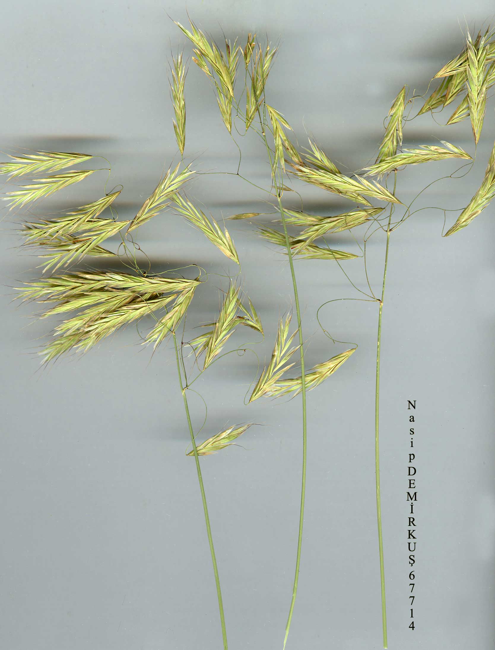 B. sterilis L., Sp. Pl 7 7 (175 3). Syn: Zerna sterilis (L.) Panzer in Denkschr. Akad. Wiss. München 4:309 (1814)! Anisantha sterilis (L.) Nevski in Acta Univ. Asiae Med. ser. 8b (Bot.) 17:20(1934)! Ic: Fl. Iraq 9: t. 54(1968);F1. RPR 12: t. 64 f. 3(1972). Annual. Stems 5-50(-90) cm, erect or ascending, glabrous. Leaf sheaths pubescent. Leaf blades 5-20 cm x2-5 mm, flaccid, softly hairy. Panicle 10-15 (-18) x 7-12 cm, very lax, usually simple; branches mostly longer than spike-lets, spreading or drooping, rarely bearing more than 1 spikelet. Spikelets 20-30(-36) x 5-8 mm, cuneiform, rough, hairy or glabrous. Lower glume 6-14 mm, subulate, upper glume 10-18 mm, linear-lanceolate. Lemma 14-19 x 2-4 mm, narrowly lanceolate, with an apical notch 1-2 mm deep; awn 15-25 mm, straight, slender, usually longer than lemma. Palea little shorter than lemma. Stamens 3; anthers 1 mm. Caryopsis 7-9 mm. Fl. 4-7. Ruderal habitats, grassy hills and as a weed of cultivated fields, s.l. -1400 m. Type (Smith, op. cit. 500, 1985): [Spain] Loefling 82 (Hb. Linn. 93/20!). Widespread. A1(E) Edirne: Karaağaç to Edirne, A. Baytop (ISTE 6612)! A2(E) Istanbul: Yildiz bahçesi, A. Baytop (ISTE 7635 p.p. - with B. diandrus)\ A2(A) Istanbul: Çatal Da., Alem Da., 5 vi 1892, Azn.! A3 Bilecik: 2 km S. of Bilecik station, 400 m, D. 42096! A4 Ankara: Hacikadin valley nr Keçiören,B3 Eskişehir: Tayciler, 1200 m, Ekim 506! B6 Adana: 7 km N. of Saimbeyli, 1400 m, Sorger 77-27-20! C2 Denizli: Tekke köy, 5 km S. of Denizli, 500 m, Hormia 627! C3 İsparta: Davras Da. above Sav köyü, A. Baytop (İSTE 9644)! C4 Antalya: Alanya promontory, 180 m, D. 25868! C6 Maraş: 24 km from Maraş, to Göksun, 1300 m, Stn. & Hend. 5525! C7 Urfa: Karaca Da., 1650 m, Kit-Tan 1671! C8 Diyarbakir: Diyarbakir, Zel 1064! C9 Siirt: 14 km from Çirnak to Cizre, 610 m, D. 42686! Is: Psara, Ahladokambos, 20 m, Greuter 10822! Europe, S.W. Asia, N. Africa. |