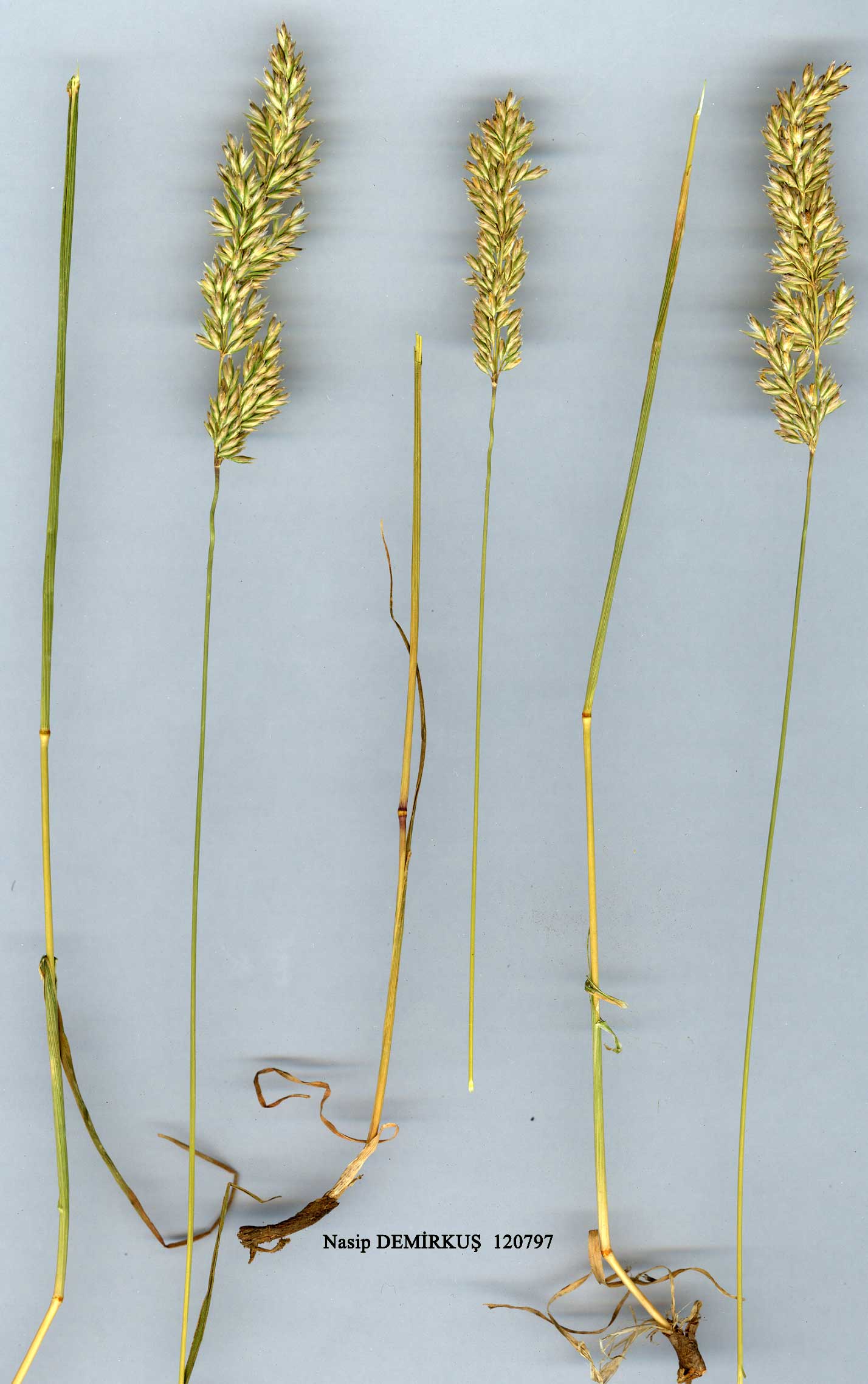 K. cristata (L.) Pers., Syn. Pl. 1:97 (1805). Syn: Air a cristata L., Sp. Pl. 63(1753)! Poa cristata (L.).L., Systema ed. 12, 2:94(1767)! Koeleria gracilis Pers., Syn. PL 1:97 (1805) nom. illegit.; Dactylis cristata (L.) Bieb., Fl. Taur.-Cauc. 1:67(1808)! Aim macrantha Ledeb. in Mem. Acad. Sci. Petersb. 5:515 (1812); K. macrantha (Ledeb.) Schultes in Schultes & Schultes fil., Syst. Veg. Mant. 2:345 (1824); K. cristata (L.) Pers. var. tenuifolia Boiss., Fl. Or. 5:5-75 (1884)! K. glaucovirens Domin in Mag. Bot. Lap. 3:273 (1904); K. pilati Ujhelyi in Ann. Hist.-Nat. Mus. Hung. 60:86 (1968);K. kurdica Ujhelyi, op. cit. 91 (1968). Ic: Fl Iraq 9: t. 131 (1968); Hubbard, Grasses ed. 2:242 (1968). Map 62. Densely caespitose perennial. Stems 8-40(-65) cm, glabrous or slightly hairy, usually erect, sometimes geniculate at base, 2-3-noded. Leaf sheaths persistent, glabrous to hairy; ligules to 2 mm, truncate; blades 2-10(-20) cm x 1-2 mm, flat or involute, green to glaucous, hairy or glabrous, mainly basal. Panicle 3.5-9(-14) x 0.5-2(-4.3) cm, cylindrical to oblong or occasionally lanceolate, rather dense, sometimes interrupted below, silvery-green or yellow. Spikelets 4-6.5(-7.3) mm, with 2-3(-4) florets. Glumes unequal, lanceolate, acute to acuminate; lower 2-4 mm, upper 3-4.7 mm. Lemma 3.3-6.3 mm, lanceolate, acute to acuminate, glabrous. Palea equalling lemma. Anthers 1.7-2(-3) mm. Fl. 6-7. Steppe, open stony places, meadows, mountain slopes, s.l-3000 m. Described from England, France & Switzerland (Hb. Linn. 85/17!). Widespread. A 1(E) Kırklareli: Haşköy to Kizilcamüsellim, A.Baytop(ISTE 6619 p.p.)! A2(E) Istanbul: Halkali, 4 v 1939, B. Post! A3 Bolu: Abant G., 17vii l940, B.Post! A4 Ankara: 8 km S.of Karagöl, 1200m, Coode& Jones 2207! A5 Çorum: Osmancık to Kargi, 600 m, Tobey 2687-1! A6 Tokat: d. Erbaa, nr Kale Köy, 300 m, Tobey 684! A7 Trabzon: Zigana Da., 2300-2400 m, T. Baytop (İSTE 14289a)! A8 Gümüşane: Baibut (Bayburt), 1862, Bour-geau! A9 Kars: 44 km W. of Iğdir, 1000 m, Spencer 0501! Bl Balıkesir: mt. Ida (Kaz Da.), Susuz Da., Sint. 1883:642! B2 Izmir: Boz Da., 1500 m, Buttler & Erben 17429! B3 Eskişehir: Türkmen Da., 790 m, Ekim 2260! B4 Ankara: nr Tuz G., 25 km N. of Koçhisar, 925 m, McNeill 338! Çankaya nr Ankara, vii 1931, A. Pilat (type of K, pilati). B5 Kirşehir: Mucur, D. 21829! B6 Sivas: 10 km S. of Gürün, Gökpinar, 1800 m, Sorger 71-50-27! B7 Tunceli: Munzur Da. above Ovacik, 2300 m, D. 31308! B8 Erzurum: above Atatürk Üniversitesi Campus, 1940-1980 m, Tatli 1522! B9 Van: Pelli Da., 3000 m, Edmondson 654! BlO Kars: 34km N.of Doğubayazit, 1650m, Spencer 0301! C2 Denizli:Honaz Da., 2300 m, Tuzlaci (İSTE 26509)! C3 İsparta: Eğridir, Yaka Köy, 1600-1980 m, Peşmen & Güner 1617! C4 Konya: Bozkir, Küçüksu, 1800 m, Çetik et al. 269! C5 Niğde: 22km E.of Ulukişla, 1200m, Sorger 62-66-7! C6 Gaziantep: Aintab (Gaziantep), Haradj. 1323! C8 Mardin: 2 km E. of Mardin, 1150 m, D. 28440! Deir Zafran, Sint. 1888:1130 (type of K. kurdica). C10 Hakkari: Zab river,-1.6 km from turning to Yüksekova, Trelawny 1306! N., W. & C. Europe, Mediterranean area (except N. Africa), Crimea, Caucasia, Iran, Transcaspia, Turkestan, S. Russia, Siberia, Afghanistan, W. Pakistan. |