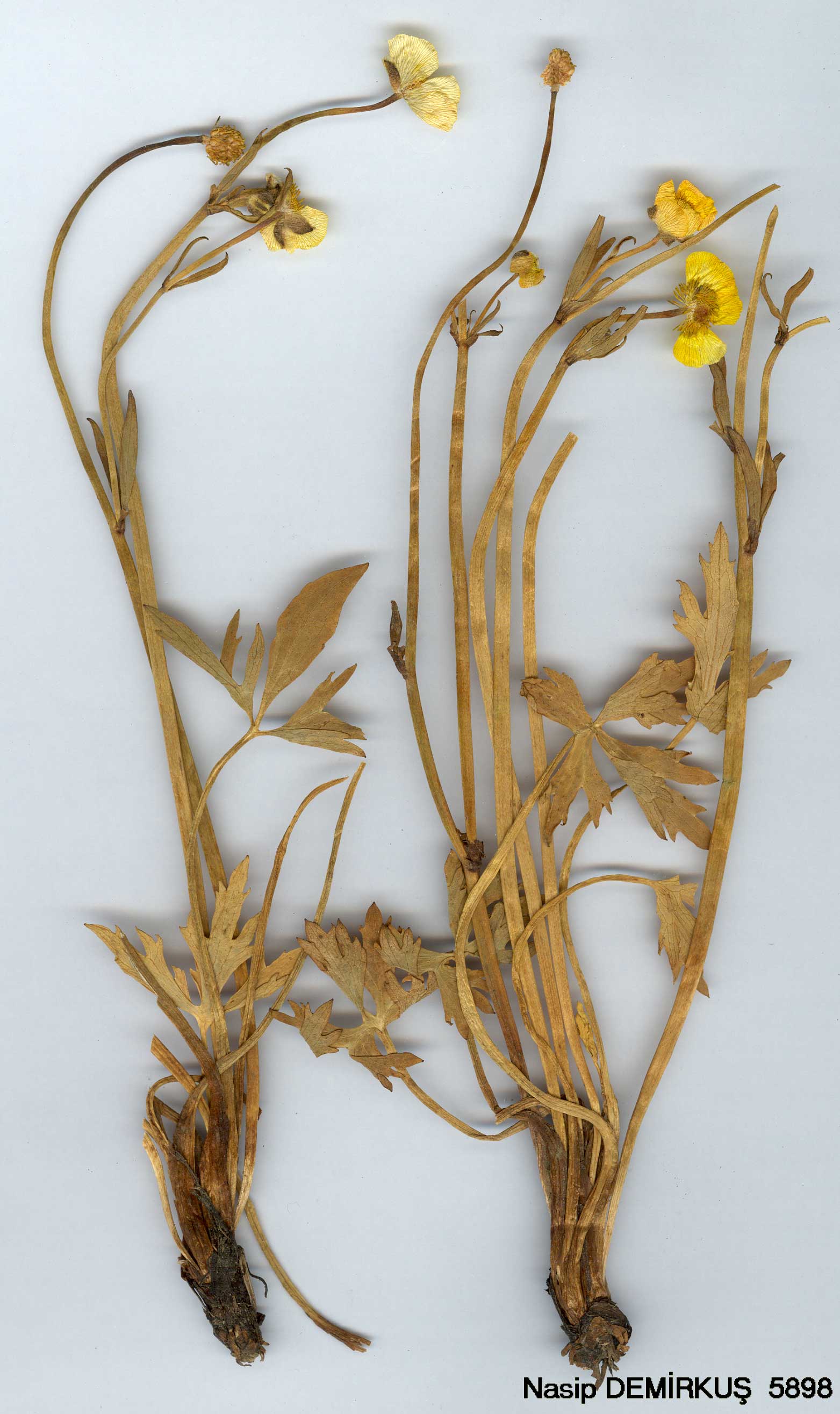 R. polyanthemos L., Sp. PL 554 (1753). I?: Reichb., Ic. Fl. Germ. 4: t. 18 (1838-39). Jav. & Csap., Ic. Fl. Hung. f. 1360(1929-34). Figures 3, 5, pp. 155, 173. Perennial, 25-40 cm, without stolons. Stems usually hirsute below (hairs rarely adpressed), branched. Radical leaves pedately and deeply tripartite or trisect, adpressed pilose or glabrous, segments 2-3-partite, incised into linear-lanceolate, often dentate laciniae (segments rarely broadly cuneate with crenate lobes). Peduncle sulcate. Sepals spreading. Petals 10-15 mm. Torus hairy. Achenes sub-orbicular, strongly compressed, keeled, 3 mm; beak triangular, uncinate, 0.5-0.75 mm. Fl. 6-7. Wet places, 600-2700 m. Described from N. Europe (Hb. Linn. 715/54!). Scattered in N. and E. Anatolia. Armenia, Calvert & Zohrab! A4 Çankiri: nr. Çandir, D. 21441! A5 Kastamonu: Tosya, Derinoss, Sint. 1889: 3876! 36 Kay-seri: Pinarbaşi, D. 21920! B9 Van: d. Hoşap, Kepir Da., 2700 m, D. 23353! A7 Giresun: d. Eseli, Goerele (Elehu), 600 m, Hand.-Mazz. 849! A8 & 9 Çoruh: Artvin & Ardanuç, A9 Kars: nr. Kağizman (Grossheim 4: map 71). Europe eastwards to Siberia, Caucasia, N. & N.W. Iran. This species has the facies of R. acris L. which apparently does not occur in Turkey. The specimens cited from Çankiri and Trabzon are both latisect variants. Hand.-Mazz. 849 was erroneously referred by its collector to R. nemorosus DC. |