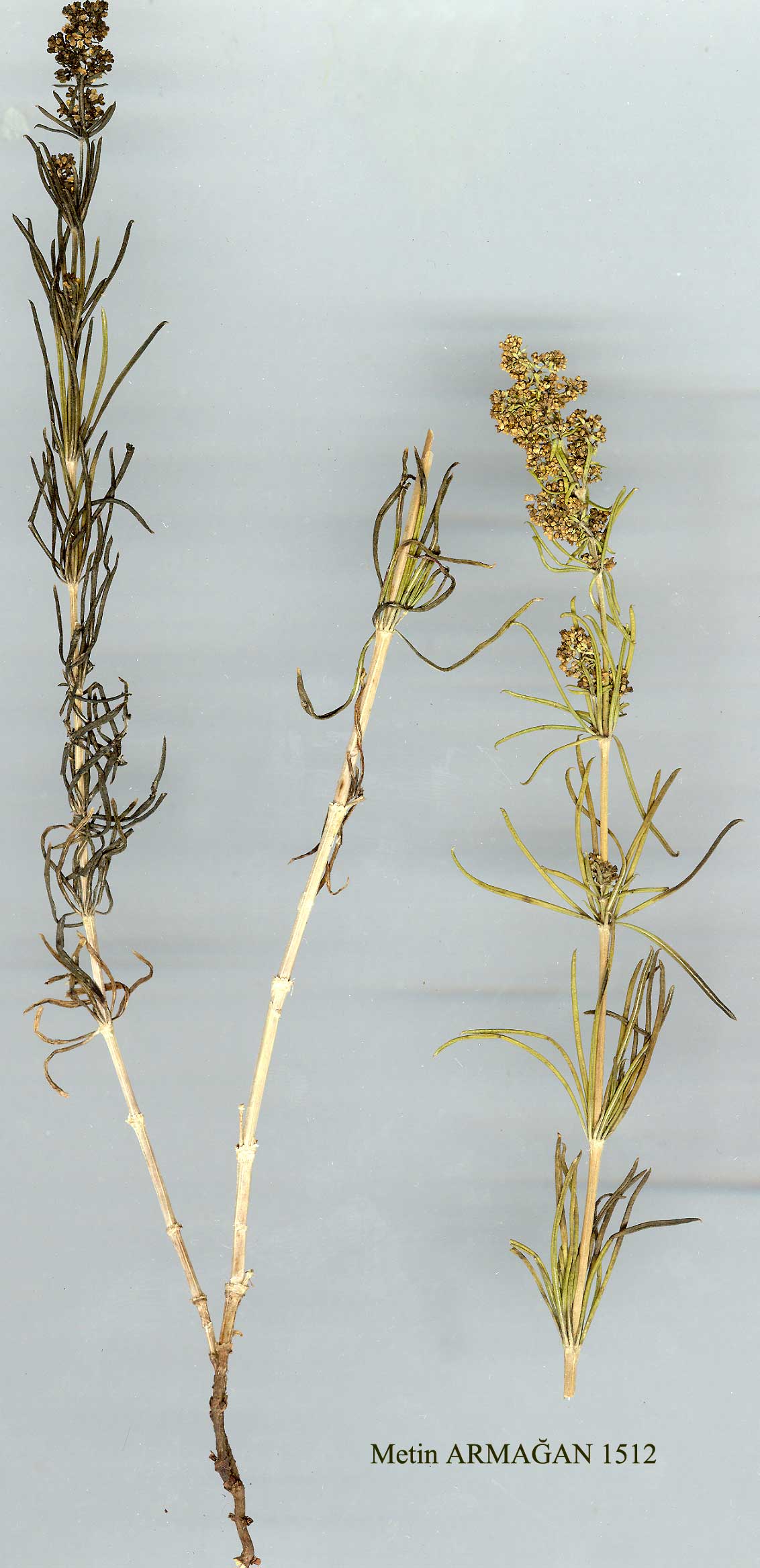 G. verum L., Sp. PL 107 (1753). Caespitose perennial, (20-)50-120 cm. Stems generally numerous, erect to ascending, simple to sparingly branched, ± terete with 4 raised lines, ± puber-ulent. Leaves in whorls of (6-)8-12, (10-)15-30(-40) x 0.5-l(-2) mm, oblanceo-late-linear to subfiliform, shortly acuminate, margins strongly revolute and scabrid, sparingly scabrid to hairy above, densely puberulent to glabrescent below, often nigrescent on drying. Inflorescence oblong to ovoid, dense, ± leafy, with short, somewhat spreading branches, densely puberulent to glabrous. Pedicels c. 1-2 mm, slender, divaricate in fruit. Bracts 1-2 mm, lanceolate. Corolla golden-yellow, rotate, 2-3.5 mm diam., with ovate-lanceolate, acute to shortly apiculate lobes. Mericarps 1-1.5 mm, finely granulate, glabrous, sometimes hairy. 1. Stems, inflorescence and lower surface of leaves ± densely puberulent subsp. verum 1. Stems, inflorescence and lower surface of leaves glabrescent to glabrous subsp. glabrescens subsp. glabrescens Ehrend. in PI. Syst. Evol. 127:304 (1977). Map 109. Fl. 6-8. Rocky slopes, scrub, cultivated land, 700-1800 m. Type: Iraq: 11 km N. of Penjwin, Rawi 22906 (holo. K!). Mainly C. & S. Anatolia. A3 Bolu: Ala Da., 1300 m, Alpay &Özgürel 211!* A4 Ankara: Kizilcahamam, Işik Da., 1700 m, Khan et al. 711! Çankiri: Çan-kiri to Ilgaz, Jenkins 2181!* C4 Konya: Konya to Çumra, Küçük Köy, 980 m, Helbaek 2560! içel: Uzuncaburç, 900 m, Sorger 71-23-21! C5 içel: Gül-lek valley, 1200 m, Kotschy 1859:354!* Adana: nr Tekir Tepesi pass between Pozanti and Gülek, 1200-1400 m, Ehrend. 62-1/68!* Adana: Missis to Sis, 2 vii 1906, B. Post! C6 Adana: Göksu gorge below Himmetli, 700-800 m, D. 19831!* Maraş: 24 km from Maraş to Göksün, 1300 m, Stn. & Hend. 5526!* W. Syria, N. Iraq, W. Iran. ir.-Tur. element? Specimens marked by an asterisk have the lower surface of leaves densely puberulent. G. bassitense Thieb. in Mem. Inst. Egypt 40:191 (1940), recorded by Mouterde, Nouv. Fl. Lib. Syr. 3:306 (1980) from the region of Antakya (C6 Hatay), possibly belongs to this subspecies. In E. Anatolia some rather remarkable representatives of the G. verum group occur. To these belong plants with ovaries densely pubescent and corollas ± hairy outside, often classified as G. ruthenicum Willd., Sp. PL 1:597 (1798) and G. atropatanum Grossh. in Not. Syst. (Leningrad) 13:26 (1950) respectively. Further investigations are needed to clarify whether or not these can be maintained as separate species. Examples include: A8 Erzurum: 11 km from Tortum to Erzurum, c. 2000 m, Ehrend. et al. 787-118-3! A9 Kars: Kağizman to Akçay (Aras valley), 1100-1200 m, D. 46853! B6 Malatya: 35 km S.E. of Darende, 1700 m, Sorger 71-47-27! B8 Bingöl: between Solhan and Boğlan pass, 49 km W. of Muş, 1600 m, Ehrend. et al. 787-77-1! B9 Bitlis: 7 km N. of Bitlis, 1700 m, Ehrend. et al. 787-84-7! B10 Ağri: c. 13 km E. of Doğubayazit, c. 1600 m, Ehrend. et al. 787-107-5! C10 Hakkari: 10 km from Bacirge to Yüksekova, 1900 m, D. 45199! The following specimens with rather broad leaves (up to 2 mm) and pubescent ovaries seem to approach G. consanguineum Boiss.: B8 Muş: Murat val- ley, 26 km from Muş to Varto, 1420 m, D. 46105! C1O Hakkari: 26 km from Şemdinli to Yüksekova, 2000 m, D. 45050! |