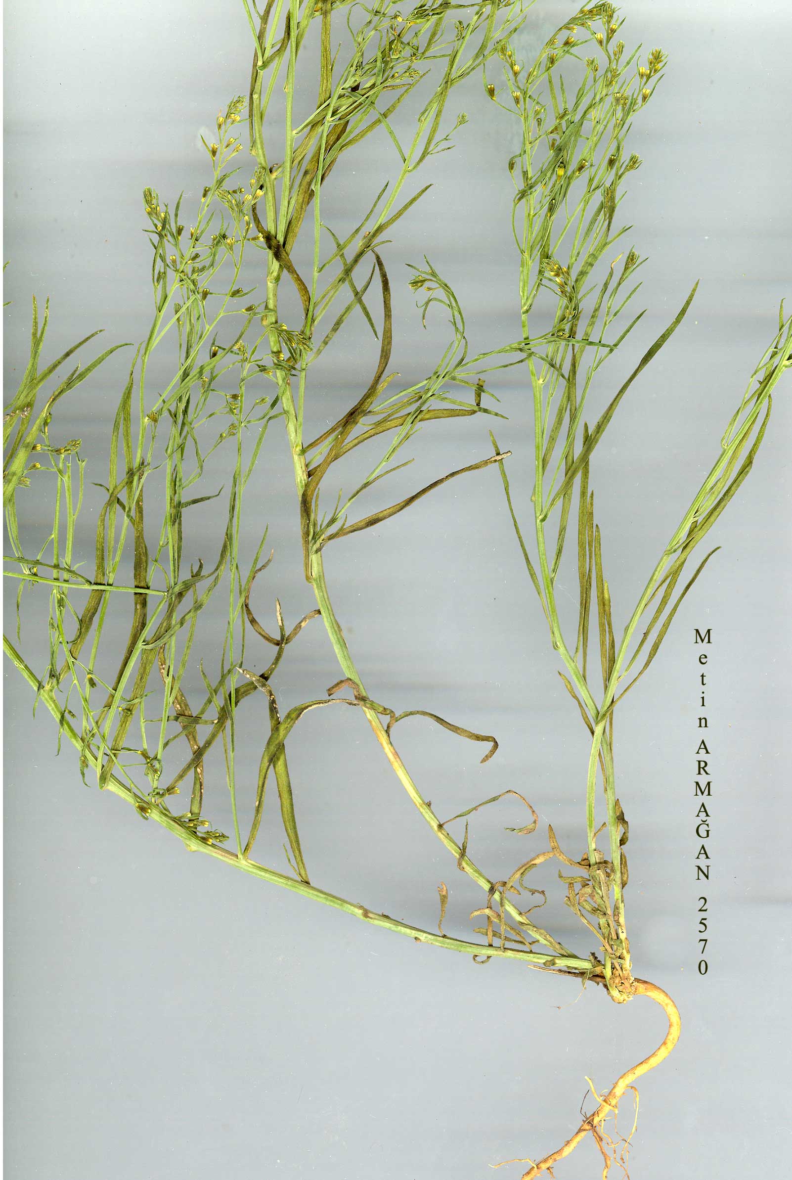 T. billardieri Boiss., Diagn. ser. 1(5):48 (1844). Syn: T. heterophyllum Boiss. in Ann. Sci. Nat. ser. 4, 2:354 (1854). Ic: Tchihat., Asie Min. Bot., Atlas: t. 38(1860). Biennial (or perennial). Leaf and bract margins (and rarely whole plant) scabrid. Stems simple or somewhat branched, procumbent to ascending, 10-30 cm. Leaves often heterophyllous; cauline narrowly oblanceolate, 3-30 x 1-1.5 mm, often secund; basal thickened, obovate, 11-25 x 4.5-7 mm. Inflores-cence a panicle, lateral cymes compact, l-3(-5)-flowered. Bracts l-3(-4) x as long as fruit. Flowers white with green veins, perianth campanulate, (1.75-) 2.75-3(-3.5) mm, lobes linear-oblanceolate, l-1.5(-3) mm. Fruit 4-5.5 x 2-2.75 mm, nut obovate, reticulate-nerved, glabrous, rarely scabrescent, persistent perianth 1/3-2/3 x as long as nut. Fl. 4-7. Quercus scrub and limestone slopes, 600-1350(-2600) m. Type: [Lebanon] in Syriae monte Djebel-Cher, Labillardière (holo. FI). S. & Inner Anatolia. A3 Ankara: Ankara to Nallihan, Akman 750! A5 Kastamonu: Tossia (Tosya), Kavak Çeşme, Sint. 1892:3973! B4 Ankara: Beynam, 1300 m, Akman 531! B7 Malatya: 44 km S. of Malatya, 1000 m, Hub.-Mor. 10413! B9 Bitlis: Nemrut Da. above crater lake, 2600 m, Peşmen 3194. C2 Burdur: 3 km N. of Dirmil (Altinyayla), 1250 m, Hub.-Mor. 8112! C3 Antalya: Korkuteli, 1050 m, Wängsjö 2747! C4 Konya: E. of Ermenek, 1300 m, Hub.-Mor. 17156! C5 Içel: Portes Ciliciennes (Gülek Boğazi), Bal. 1855:767! C6 Hatay: Beilan(Belen), 1200 m,Kotschy 1862:6390! C8 Mardin: Sultan, 20 km N. of Mardin, 1000 m, M. Zohary & Plitm. 1968:35! Lebanon, Anti-Lebanon, Palestine. Ir.-Tur. element. T. billardieri is an extremely variable species, particularly in the persistent perianth to nut ratio. I have been unable to recognise any infraspecific taxa although two specimens are especially noteworthy: Fitz et al. from C2 Antalya: Elmali differs in having a branched, not capitate rootstock at ground level and Akman 9103, from A3 Ankara: Nallihan, differs in facies and fruit shape. |