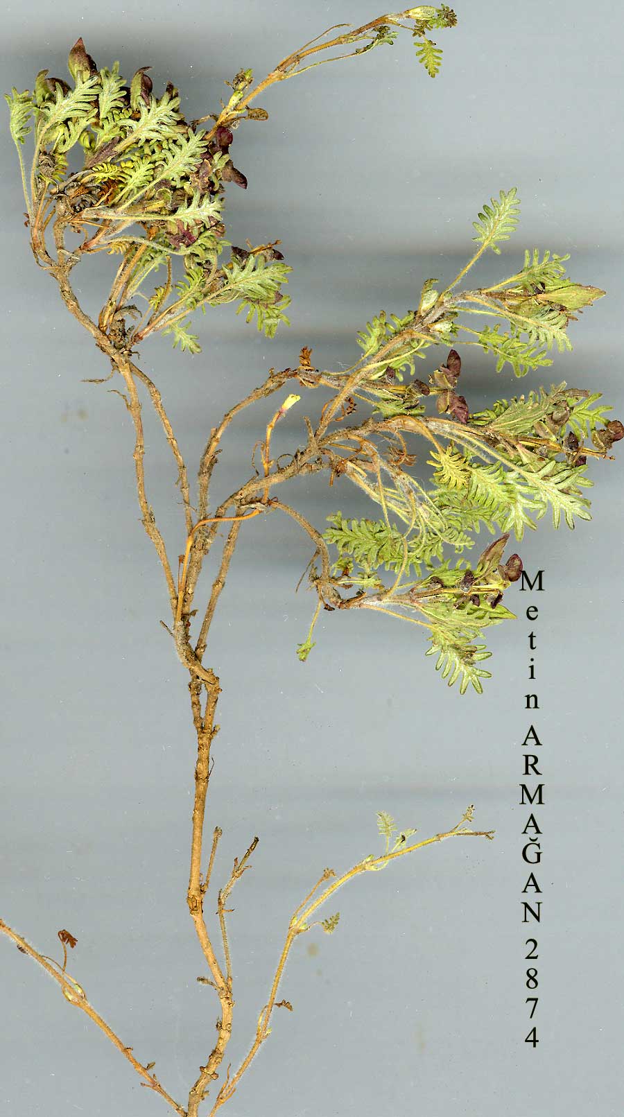 V. fridericae M.A. Fischer in Pl. Syst. Evol. 144:67 (1984). Rootstock robust, giving rise to many flowering stems 10-15 cm. Stems densely eglandular-puberulent, with minute (0.1-0.2 mm), reflexed or recurved hairs; internodes 7-15 mm. Leaves pinnatipartite, pinnatifid, remotely serrate or entire, linear-lanceolate, 10-25 x 1-8 mm, segments linear or triangular-lanceolate, 0.5-2 mm broad, with revolute margins; indumentum of short recurved hairs, very densely velvety, subcanescent. Terminal shoots (above racemes) 5-20 mm. Racemes 1-2, 15-30-flowered, 2-5 cm in fruit; peduncle 1.5-4 cm, densely eglandular-puberulent. Bracts 2-3 mm. Pedicels 3-6 mm in fruit, + patent, 2 x bracts. Fruiting calyx 3-5 mm, pubescent; hairs 0.1-0.3 mm, + recurved. Corolla unknown. Capsule turgid, 3.3-4x3.5-4 mm, truncate at base, acutely emarginate and emucronate, rather densely puberulent; hairs 0.05-0.2 mm. Style (3-)3.7-4.3 mm. Seeds 4 per capsule, 2.5x1.1-1.5 mm, slightly cymbiform, ochre-yellow. Fl. 6. Alpine steppe, c. 2800 m. Type: Turkey B9 Van: Güzeldere geçidi (i.e. jugi transitum inter pagos Başkale et Hoşap), 36 km N.W. a pago Başkale; alpinetum solute (40%) vestitum, 2790 m, 9 vii 1982, Friederike Sorger & Peter Buchner, Sorger 82-57-54 (holo. Hb. Sorger! iso. WU!). S.E. Anatolia. B9 Van: Güzeldere pass, 2790 m, Sorger 81-35-58! Endemic. Ir.-Tur. element. Evidently related to V. acrotheca Bornm. & Gauba and V.farinosa Hausskn., both of which inhabit W. Iran. For a discussion, and a revised key to the hairy- and pinnatifid-leaved perennial Veronicas (Group C in the Flora of Turkey key [6:696]), see Fischer, op. cit. 68-70 (1984). |