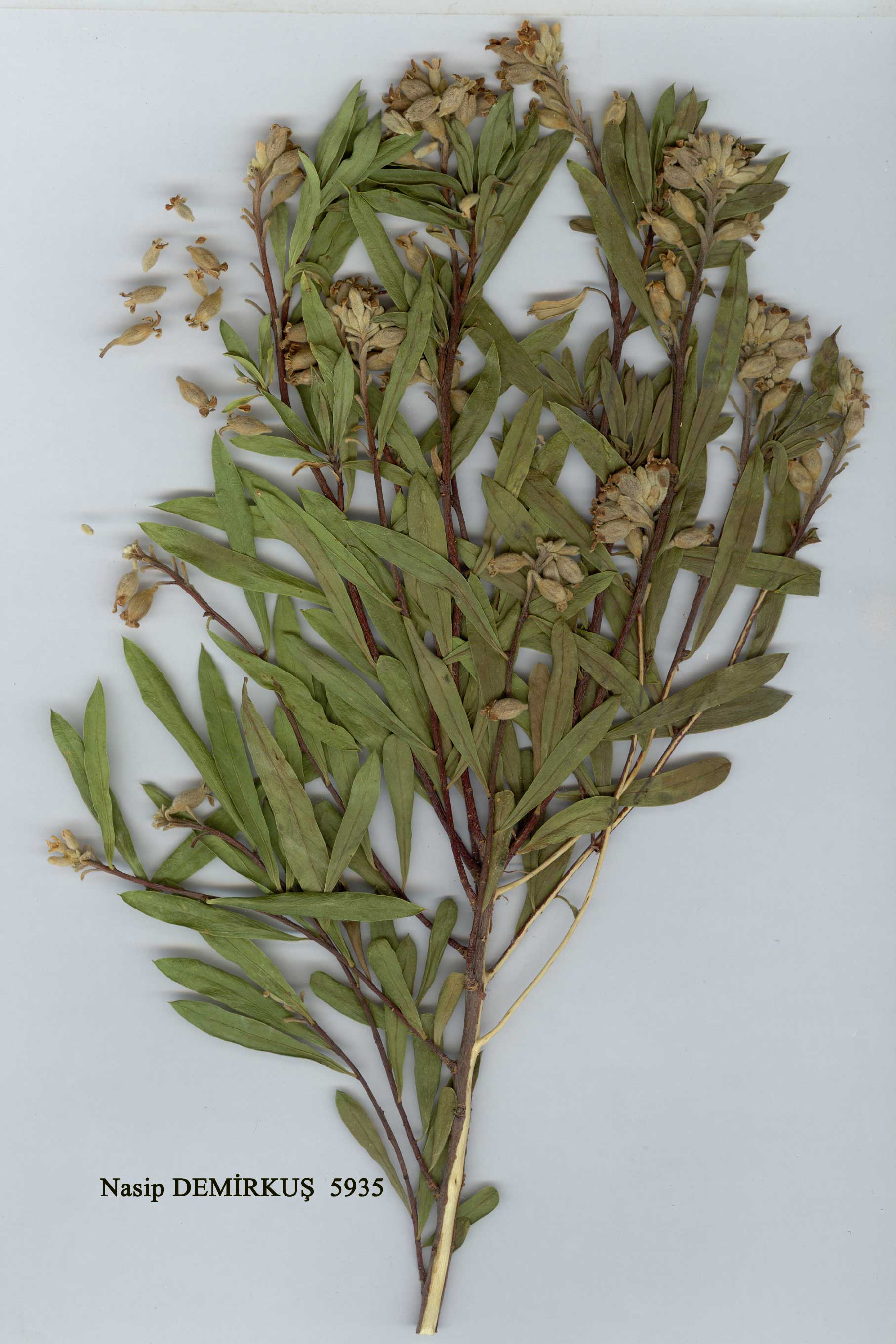 | D. mucronata Royle, I11. Bot. Himal. Mount. 1:322, 2: t. 81, f. 2a-i (1836). Syn: D. angustifolia C. Koch in Linnaea 22:611 (1849); D. acuminata Boiss. & Hohen. ex Stocks in Hooker, J. Bot. Kew Gard. Misc. 4:180 (1852)! D. acuminata Boiss. & Hohen. ex Boiss. in Boiss., Diagn. ser. 1(12): 103 (1853)! D. mucronata Royle var. affghanica Meissn. in DC, Prodr. 14:536 (1857)! D. acuminata Boiss. & Hohen. ex Stocks var. kochii Meissn., loc. cit. (1857);D. angustifolia C. Koch var. affghanica (Meissn.) Keissler in Bot. Jahrb. 25:65 (1898)! Erect shrub 0.5-3 m. Branches reddish-brown, glabrous (very rarely pubes-cent) in leafy parts. Leaves subsessile or shortly petiolate, narrowly elliptic, (30-)40-60 x 5-9 mm, acuminate or mucronate, glabrous. Flowers fragrant, 8-14, in short terminal racemes; pedicels elongating to 5 mm. Bracts absent. Perianth sub-persistent, 9-14 mm, yellow-sericeous; lobes ovate, 4x2 mm, obtuse or broadly acute. Ovary pubescent. Fruit 7-9 mm, orange-red. Fl. 6-9. Rocky slopes of gorge, limestone, dry open fields, 1100-2280 m. Type: [W. Himalayas] Kunawur, Royle 166/5 (holo. LIV!). S.E. Anatolia. B9 Bitlis: 9 km S. of Bitlis, 1400 m, Hub.-Mor. 11527! Van: 5 km N. of Çatak, 1500- 2000 m, D. 23187! C9 Van/Hakkari: 164 km S. of Zap gorge, 1800 m, Birand & Karamanoğlu 410! Hakkari: below Çukurca, 1100 m, D. 44850! C10 Hakkari: Zap river, 1.6 km from turning to Yük-sekova, Trelawny 1314! Sat Da., between Yüksekova and Varegöz, 1900-2000 m, D. 45569! N. Iraq, Iran, Transcaucasia, Afghanistan to W. Himalayas; Arabia. Ir.-Tur. element. Closely allied to D. gnidioides but in Turkey is distinguished by its glabrous branches, larger leaves and flowers. After studying the species throughout its geographical range it was decided not to assign the Turkish material to any infraspecific group. Similar plants are found in Iraq, Afghanistan and W. Pakistan; those from Iran often have grey, very pubescent branches. Royle's specimen from N.W. India has grey-pubescent stems and much smaller (15-30 x 3-5 mm) leaves. |