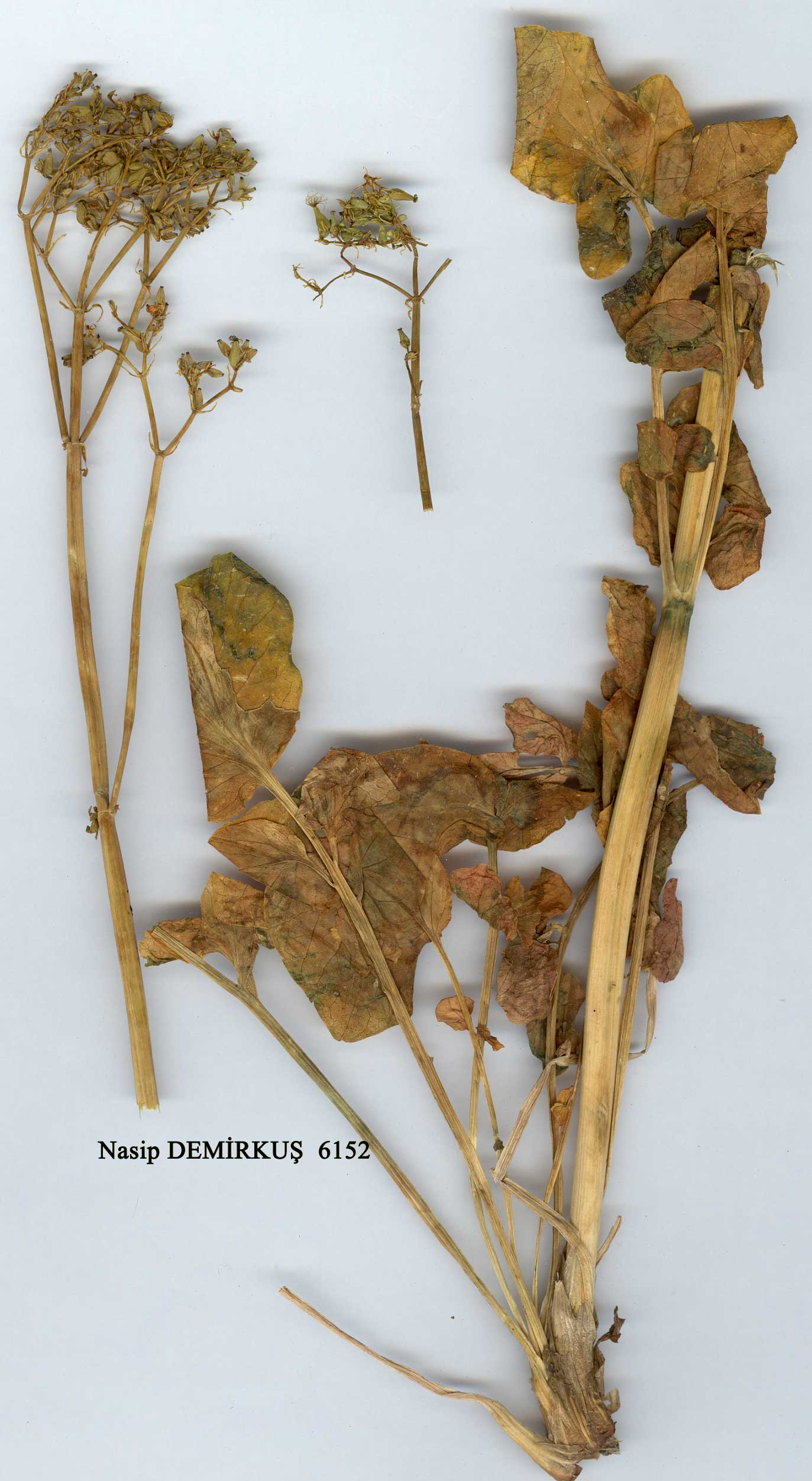 V. sisymbriifolia Vahl, Enum. P1. 2:7 (1805). Syn: V. cardamines Bieb., Fl. Taur.-Cauc. 1:24 (1808). Ic: Desf., Choix P1. t. 41 (1808). Map 80, p. 555. Perennial herb. Rhizome cylindrical, praemorse, giving rise to slender, cylindri-cal roots. Caudex usually surrounded by remains of old leaf-bases. Stems l-2(-4), sturdy, erect, 15-60 cm tall, subsulcate. Basal leaves glabrous, pinnate, (l-)3-7(-ll)-lobed; lobes ovate-orbicular, entire to repand, sometimes crenate, terminal larger than laterals; petioles usually equal to, or longer than, lobed part of leaf. Lower cauline leaves similar to basal leaves; petioles amplexicaul and fused at their bases to c. 2 mm. Lobes of upper cauline leaves occasionally lanceolate. Inflorescence dense, corymbose, c. 2 cm diam. in flower, spreading in fruit. Flowers pink or white. Achene uniformly pubescent, rarely subglabrous. Fl. 5-9. Rocky ledges and slopes, usually in shade, 1500-3500 m. Described from the Orient. S. & E. Anatolia. B6 Adana: d. Saimbeyli, Bozoğlan Da. above Obruk yayla, 2100 m, D. 19729! Sivas: 48 km from Gürün to Pınarbaşı, 2300 m, Stn. & Hend. 5688! Maraş: 27 km N. of Göksun, 1550 m, Hub.-Mor. 11523. B7 Erzincan: Keşiş Da. above Cimin, 2800-2900 m, D. 31801! Tunceli: Munzur Da. above Ovaçik, 2900 m, D. 31258! B8 Bitlis: Kambos Da. above Hurmuz, 2000 m, D. 23463! B9 Bitlis: Karz Da. above Kotum, 1800 m, D. 22250! Ağri: 5-10 km from Hamur to Tutak (Murat valley), 1650 m, D. 44051! Van: Şuşanis Da. above Van, 2200 m, Hub.-Mor. 10260. C4 Konya: Masmutli Da., Siehe 340. C5 Niğde: Ala Da., Arpalık gorge, 2190 m, Parry 153! C6 Maraş: d. Çardak, Berit Da. above Arpa Çukuru, 2700 m, D. 20320! C10 Hakkari: Cilo Tepe, 3200 m, D. 24066! N. Iran, S. & E. Caucasia, C. Asia. Ir.-Tur. element. |