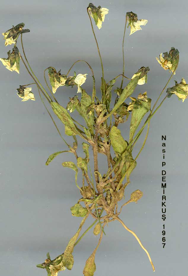 V. occulta Lehm., Ind. Sem. Hort. Hamb. (1829). Schmidt in Ber. Deutsch. Bot. Ges. 75(3): 78-84 (1962). Annual herb. Stems erect, 3-15 cm. Leaves narrowly oblong-spathulate, re-motely crenate-serrate, glabrous to pilose-scabrous. Stipules deeply divided. Pedicels ebracteolate or with minute bracteoles adpressed to the calyx. Sepals broadly lanceolate, as long as or longer than the corolla, their appendages.com-pletely exceeding the corolla spur. Corolla white to cream, sometimes the petals with bluish margins. Fl. 4-5. Cultivated land, 900-2190 m. Scattered, not in the E. A3 Ankara: Beypazarı, 1200 m, Kühne 569! Bolu: Seben, 800 m, Kühne 2041! A7 Gümüşane: Gümüşane, Godena, Sint. 1894: 5479! B2 Uşak: above Uşak, Bal. 156! B4 Ankara: Ankara, Kühne ! B6 Malatya: nr. Akça Da., 1000 m, D. 27666! (2n = 20, Schmidt, op. cit.). C5 Niğde: Bereketli, Bal. C6 Gaziantep: Gaziantep, 1000 m, Haradj. 868! Niğde: Ala Da., Arpalik gorge, 2190 m, Parry 149! Seyhan: Dumanli Da., above Haruniye, 1200 m, D. 26838! Cyprus, W. Syria, Transcaucasia, Crimea, N. & W. Iran. Intermediates occur between V. occulta and V. modesta. |